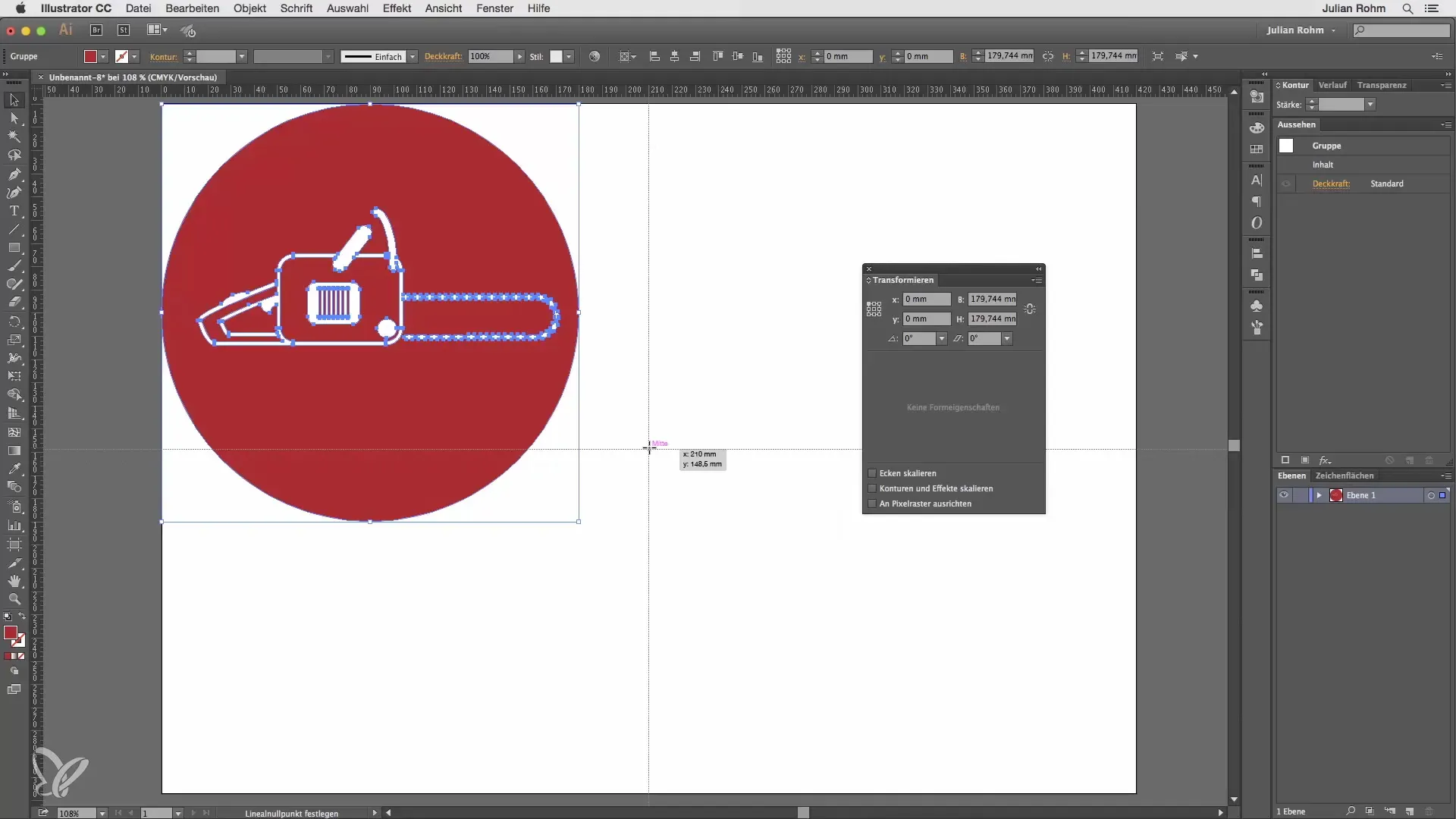 Solltest du die Koordinaten für ein Objekt benötigen, wähle das Objekt an und stelle die x- und y-Werte auf 0. Dies platziert das Objekt genau in der Mitte zu deinem Nullpunkt.