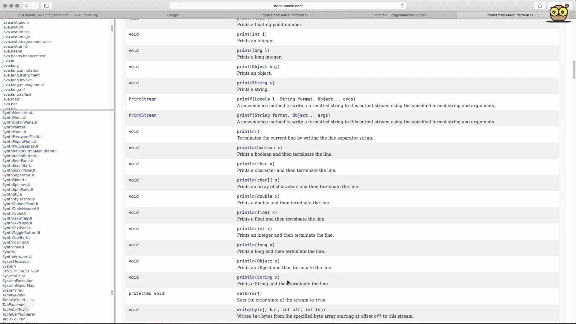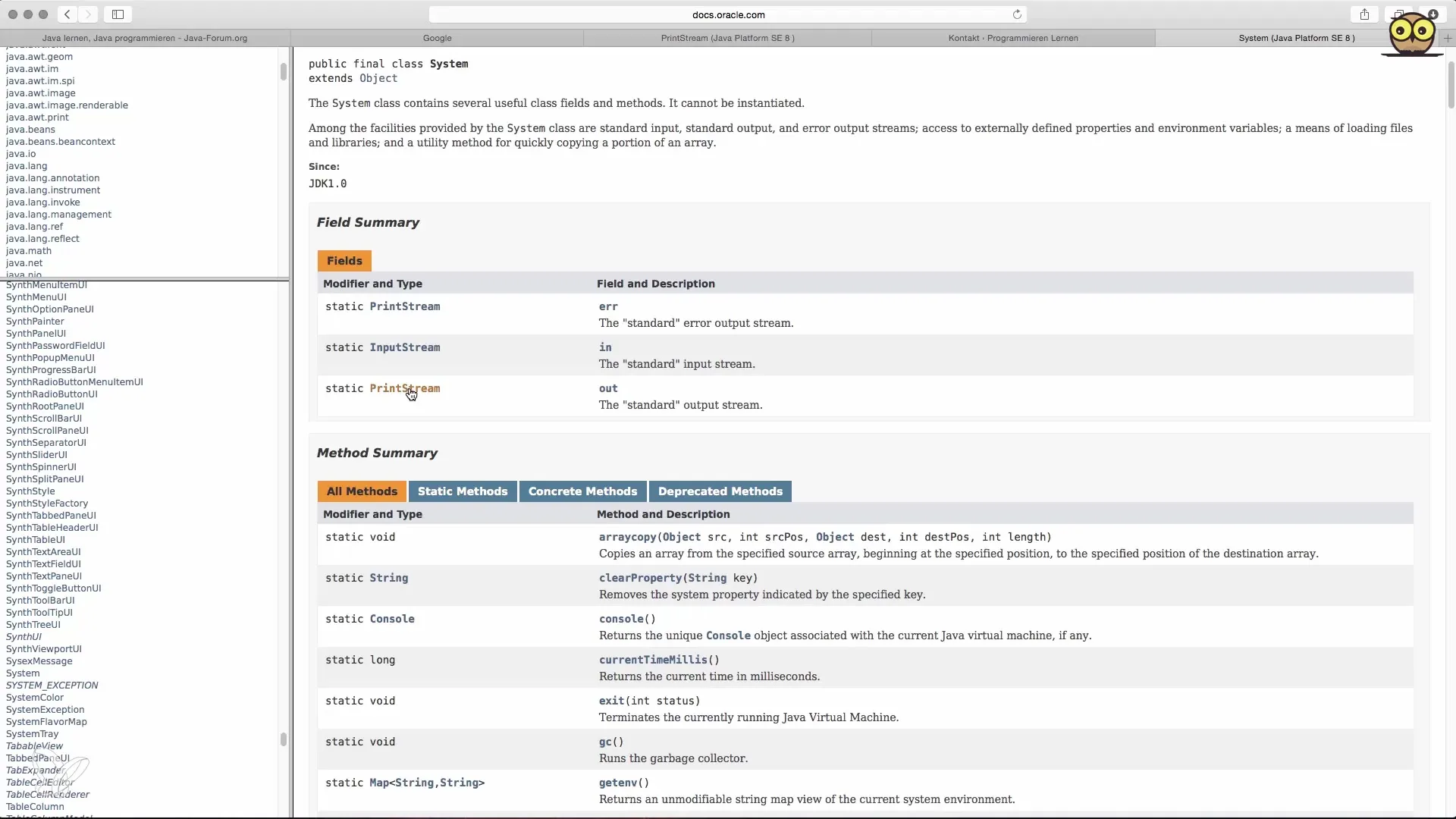 Wenn du die Dokumentation aufrufst, erhältst du eine Übersicht über alle Klassen und deren Methoden. Zum Beispiel die Klasse System, die eine zentrale Rolle spielt. Sie bietet unter anderem den PrintStream mit Methoden, die du beim Ausgeben von Text benötigst.