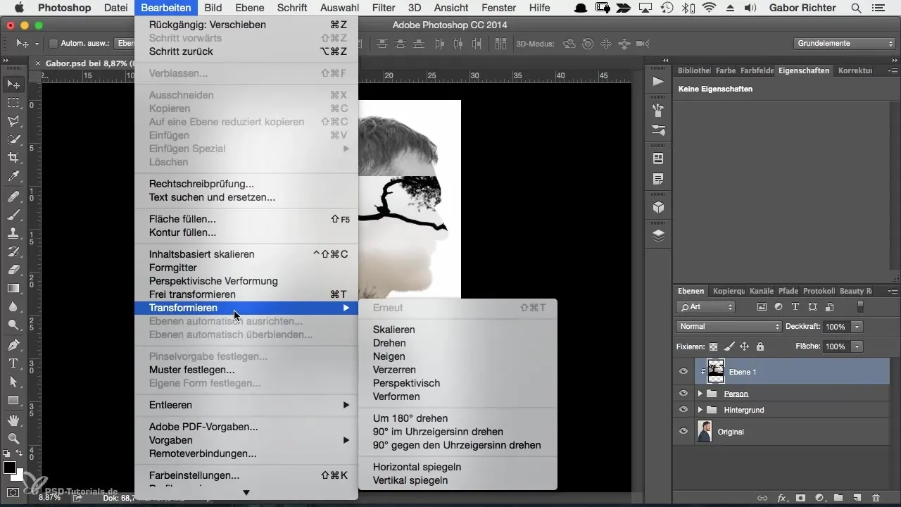 Falls dein Bild zu klein ist, kannst du es vergrößern. Gehe dazu zu "Bearbeiten", dann "Transformieren" und wähle "Frei transformieren". Halte dabei die Shift-Taste gedrückt, um die Proportionen beizubehalten. Wenn du das Bild entsprechend anpasst, siehst du das gesamte Verhältnis erhalten.