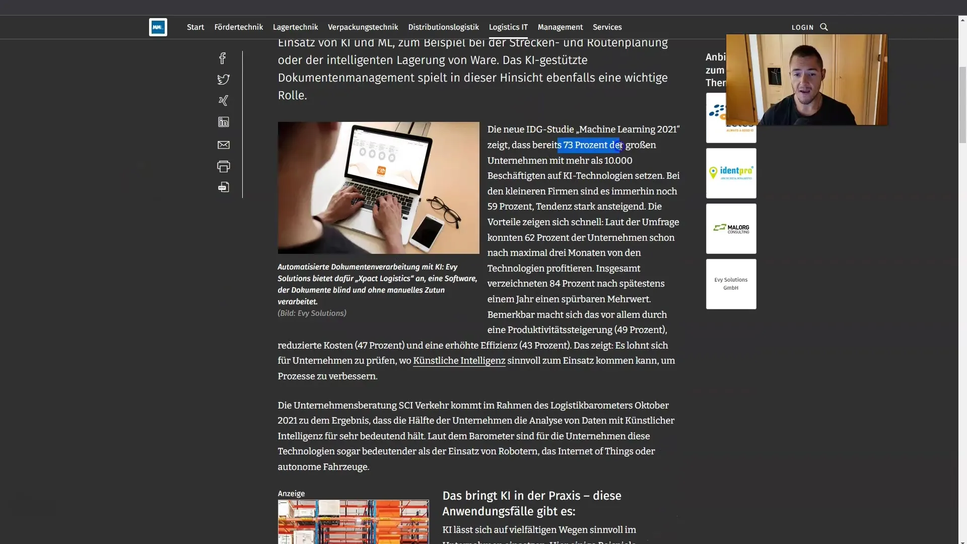 Der erste Schritt besteht darin, die Vorteile von KI zu verstehen. Künstliche Intelligenz kann in der Logistik helfen, Prozesse zu verbessern und die Effizienz zu steigern. Nach einem Artikel vom Logistikvogel nutzen bereits 3% der Unternehmen mit mehr als 10.000 Mitarbeitern KI in der Logistik. Diese Unternehmen berichten von einer Produktivitätssteigerung innerhalb von drei Monaten und 84% sind überzeugt, dass AI langfristig einen Mehrwert bietet.