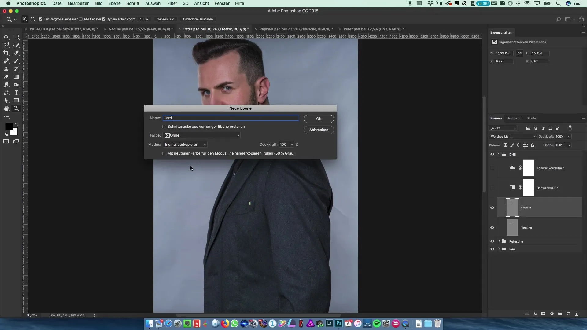 Erstelle jetzt eine zweite Dodge-and-Burn-Ebene, die du kreativ nennst. Auch hier wählst du wieder „Weiches Licht“ als Füllmethode. Ziel ist es, im Gesicht Highlights zu setzen und Schatten gezielt zu verstärken, um dem Bild mehr Tiefe zu verleihen.