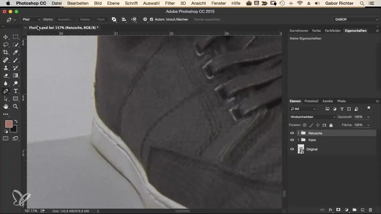 Stelle sicher, dass du das Zeichenstift-Werkzeug ausgewählt hast. Es ist wichtig, dass die Funktion „Form“ deaktiviert ist und „Pfad“ eingeschaltet ist, damit du die Kanten der Auswahl präzise steuern kannst. Zoome mit der Lupe auf etwa 200% hinein, damit du alle Details gut siehst.