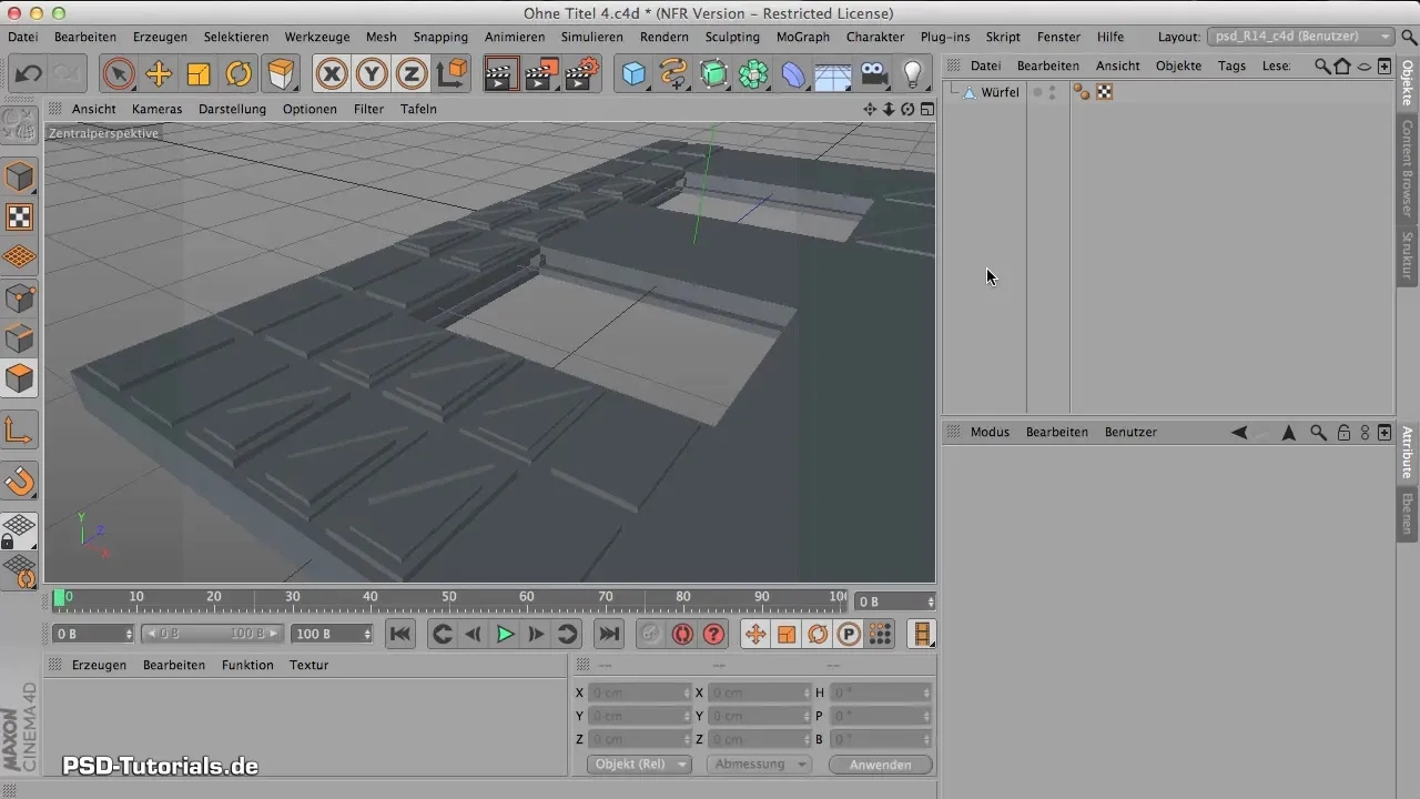 Sobald du Greebler installiert hast, öffne dein 3D-Modell und wähle den Würfel oder das Objekt aus, dem du Details hinzufügen möchtest. Entferne alle überflüssigen Selektionen, um besser arbeiten zu können.
