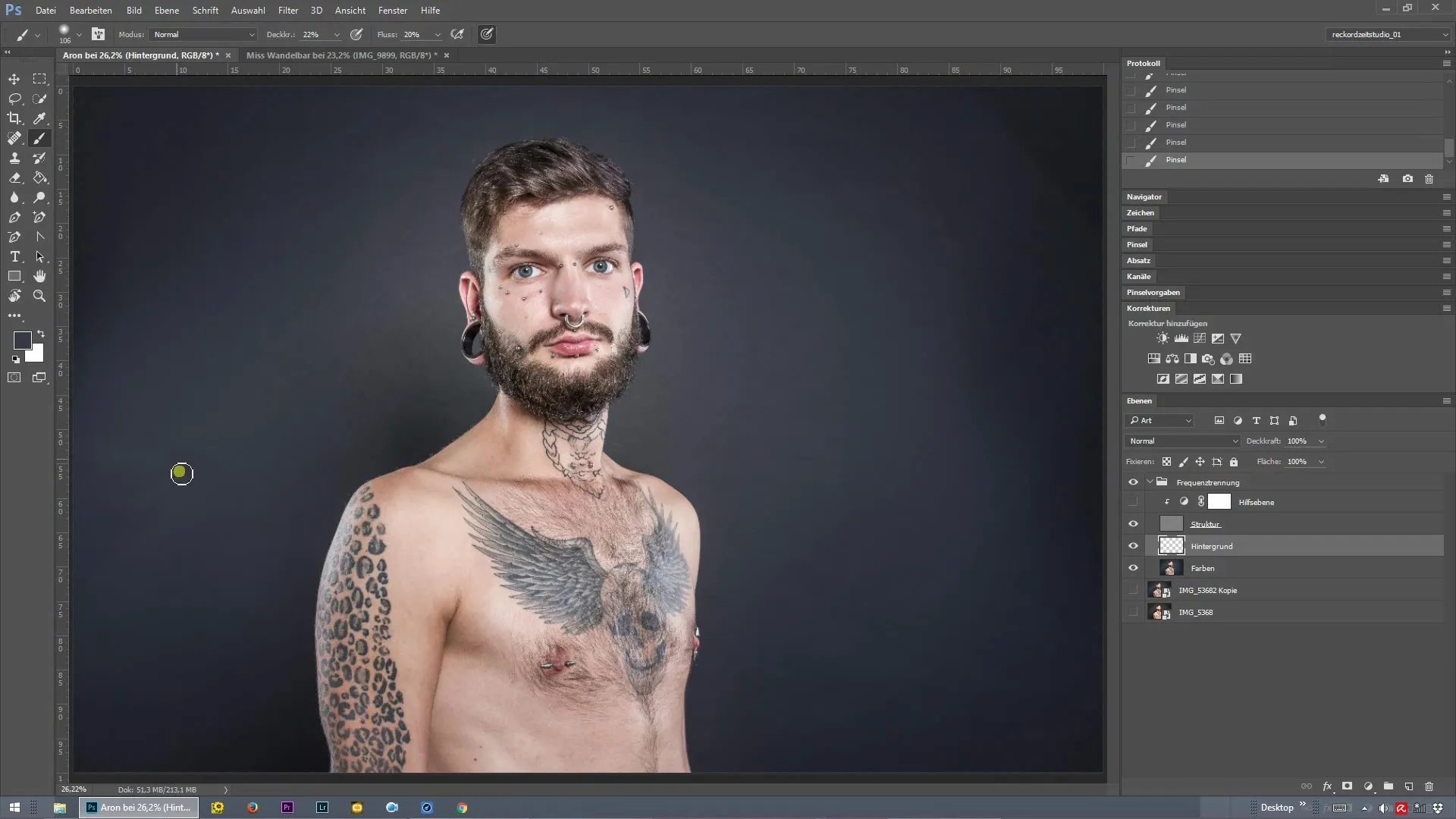 Um die Frequenztrennung für die Hintergrundretusche anzuwenden, folge diesen Schritten:
