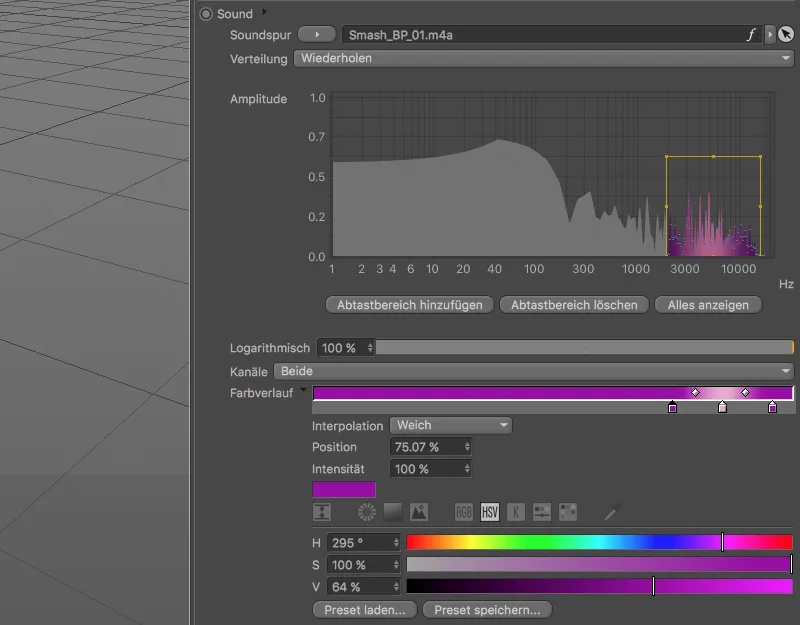 Der Übersichtlichkeit halber benennen wir den duplizierten Sound-Effektor gleich entsprechend um. Dank unserer Kopie ist der Sound bereits im Einstellungsdialog auf der Effektor-Seite enthalten, sodass wir uns direkt dem gewünschten Frequenzbereich und den Farben im zugehörigen Farbverlauf zuwenden können.