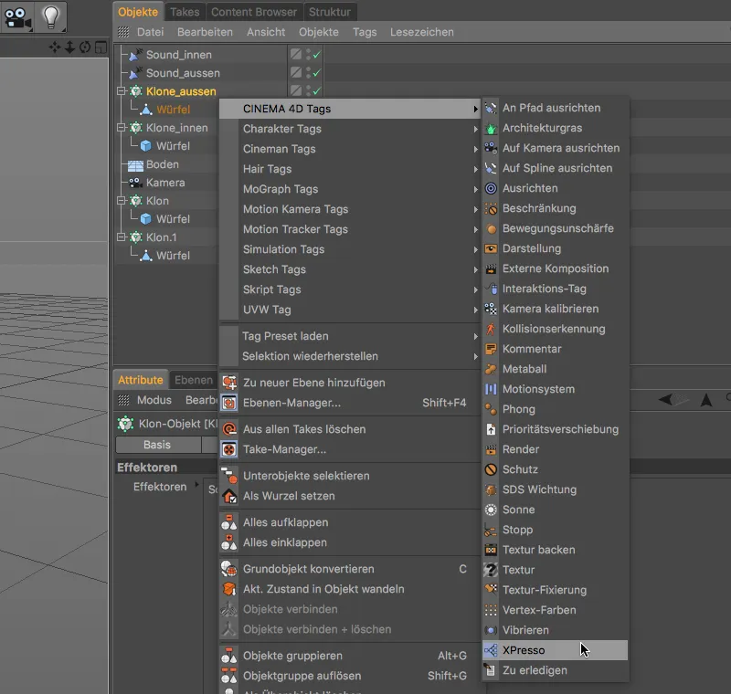 Wir beginnen mit der XPresso-Expression für den äußeren Klon-Ring und weisen diesem Klon-Objekt über das Kontextmenü der rechten Maustaste aus den CINEMA 4D Tags ein XPresso-Tag zu.