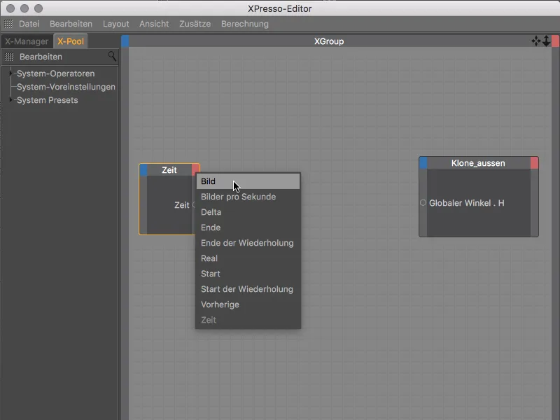 Gesteuert werden soll die Rotation des Klon-Rings in Abhängigkeit von der Zeit bzw. dem aktuellen Bild. Diese Information bietet uns der Zeit-Node, den wir im Kontextmenü der rechten Maustaste unter Neuer Node>XPresso>Allgemein finden.