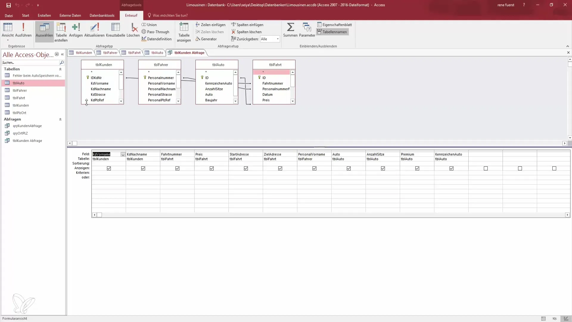 Jetzt wird dir die Abfrage angezeigt, die alle von dir ausgewählten Felder enthält. Du bekommst eine Übersicht der Kunden, ihrer Fahrten, der Fahrer und alle entsprechenden Angaben an einem Ort.