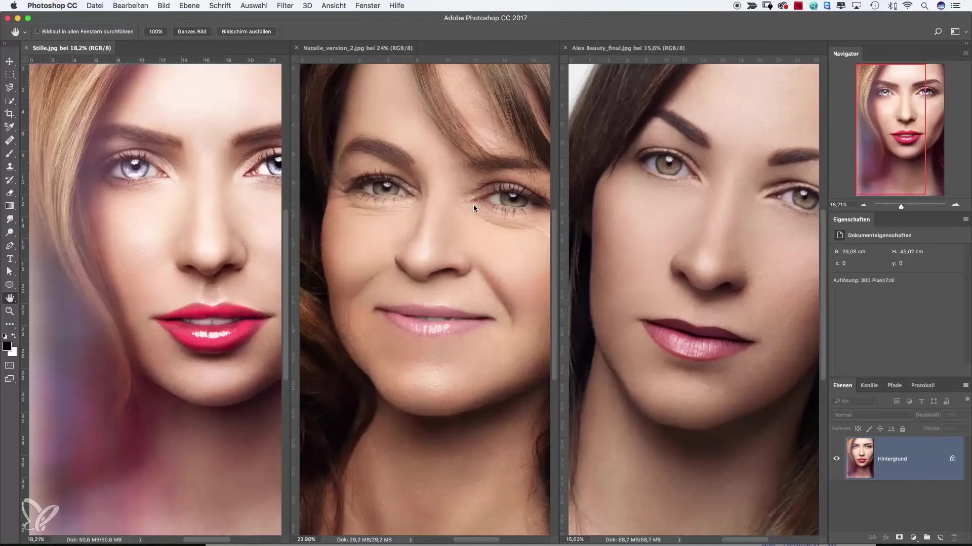 Wenn du an Details arbeiten möchtest, aktivierst du das Zoom-Werkzeug. Das wird dir erlauben, in ein Bild zu zoomen, während die anderen Bilder ebenfalls gezoomt werden, solange du die „Bildlauf in alle Fenster durchführen“-Option aktivierst.