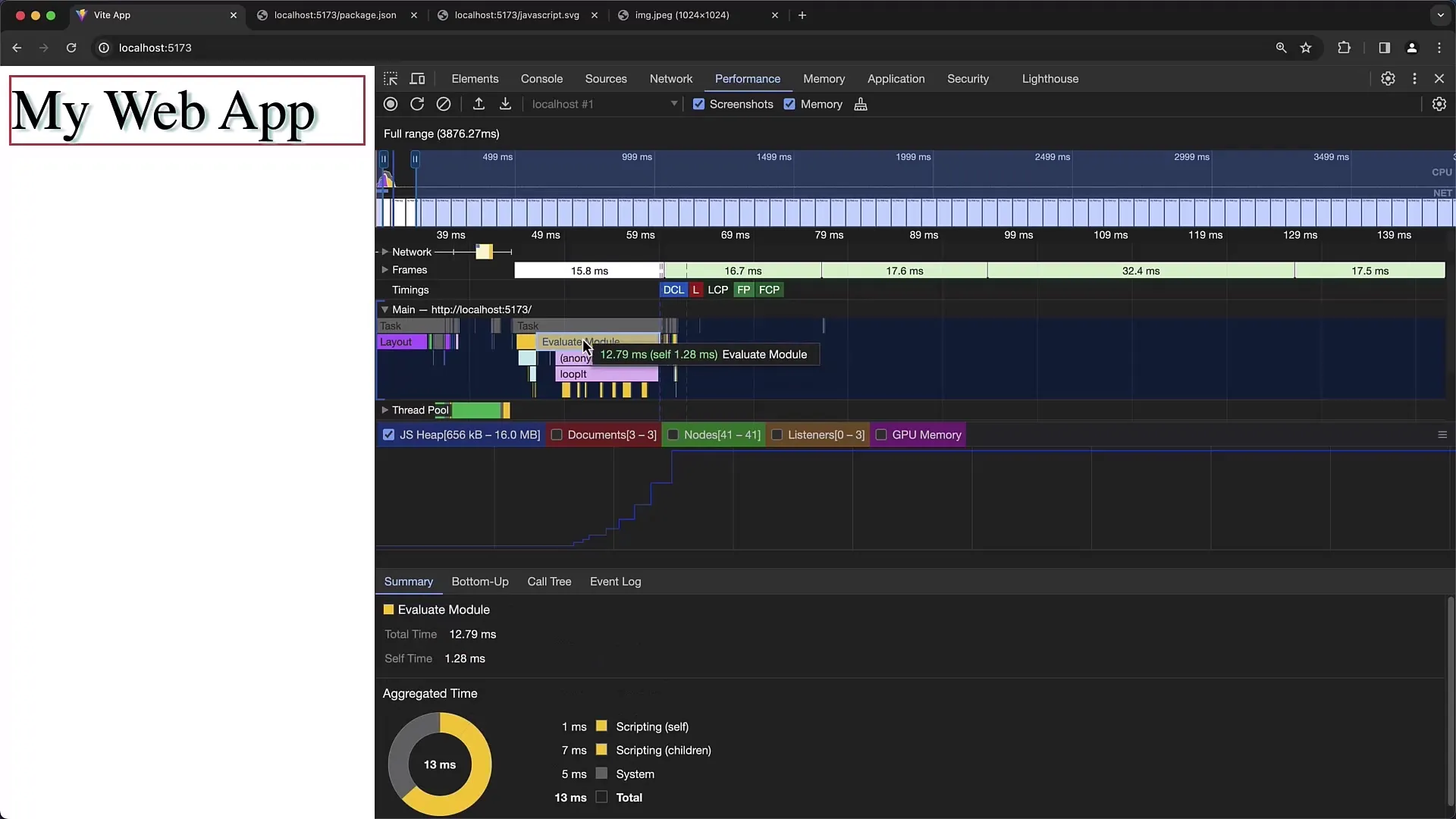- Du kannst detaillierte Informationen über Scripting, Rendering und Speicherverbrauch abrufen.