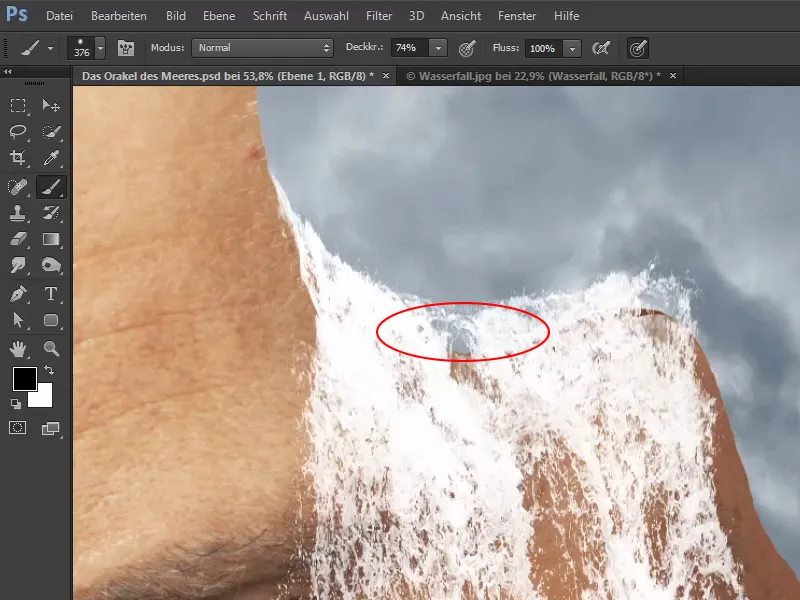 Das Schöne an solchen Pinseln ist, dass es so aussieht, als würde das Wasser nach oben noch etwas spritzen. Deshalb könnt ihr da ruhig auch mal über den Rand hinaus klicken. Für solche Wasserspritzer könnt ihr die Deckkraft dann auch wieder etwas erhöhen. Marco stellt sie hierfür auf 68% ein.
