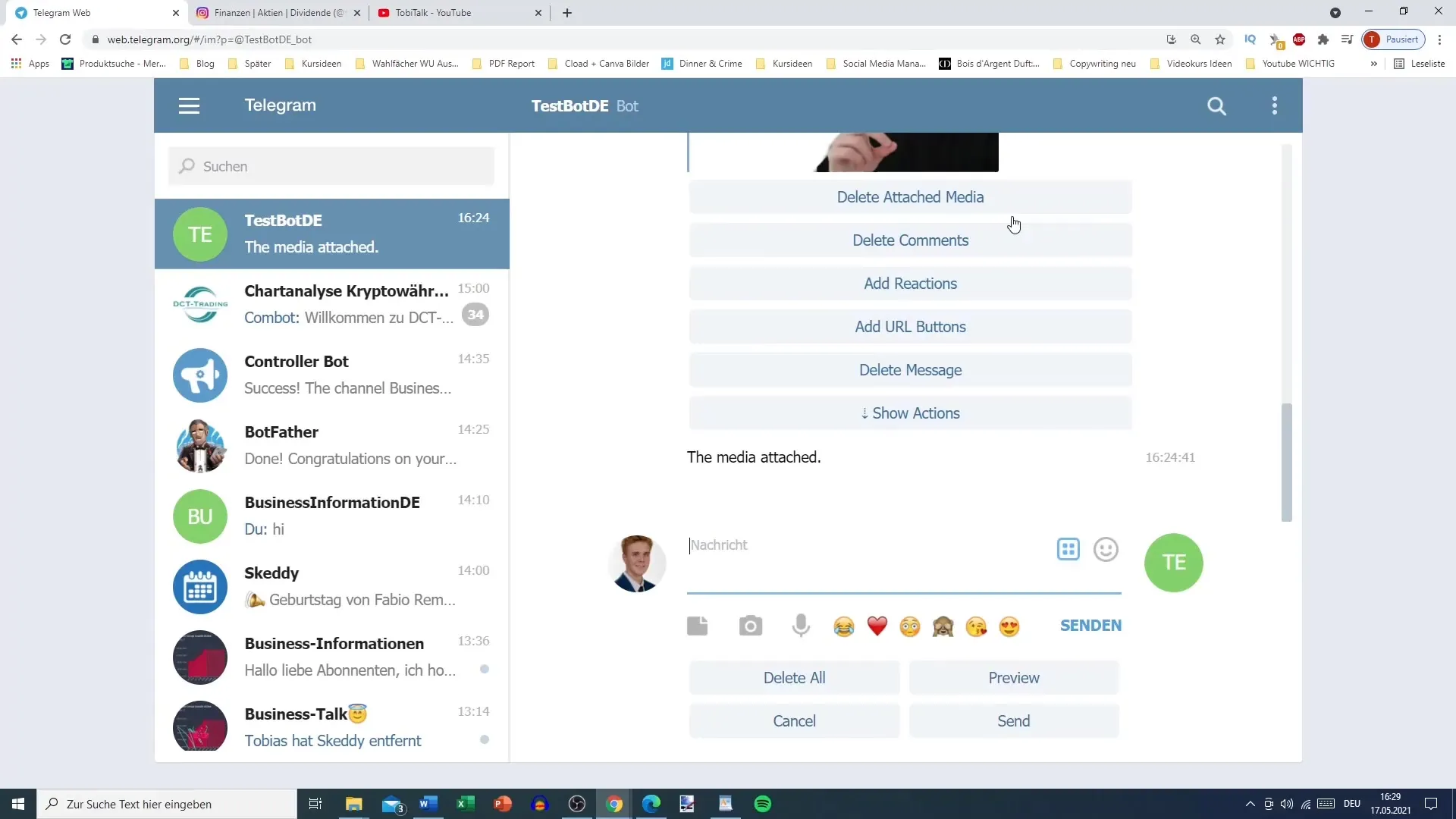 Jetzt siehst du in deinem Telegram-Nachrichtentext sowohl deinen YouTube-Kanal als auch deinen Instagram-Link als klickbare Buttons. Diese Funktionen sind besonders nützlich, um deine Online-Präsenz zu fördern.