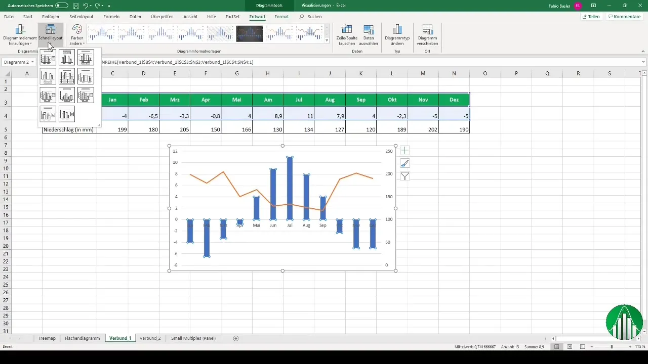 Wähle das Kombidiagramm aus. Du möchtest beispielsweise die Temperatur als gruppierte Säulen und den Niederschlag als Liniendiagramm anzeigen. Stelle sicher, dass der Niederschlag auf einer sekundären Achse dargestellt wird.