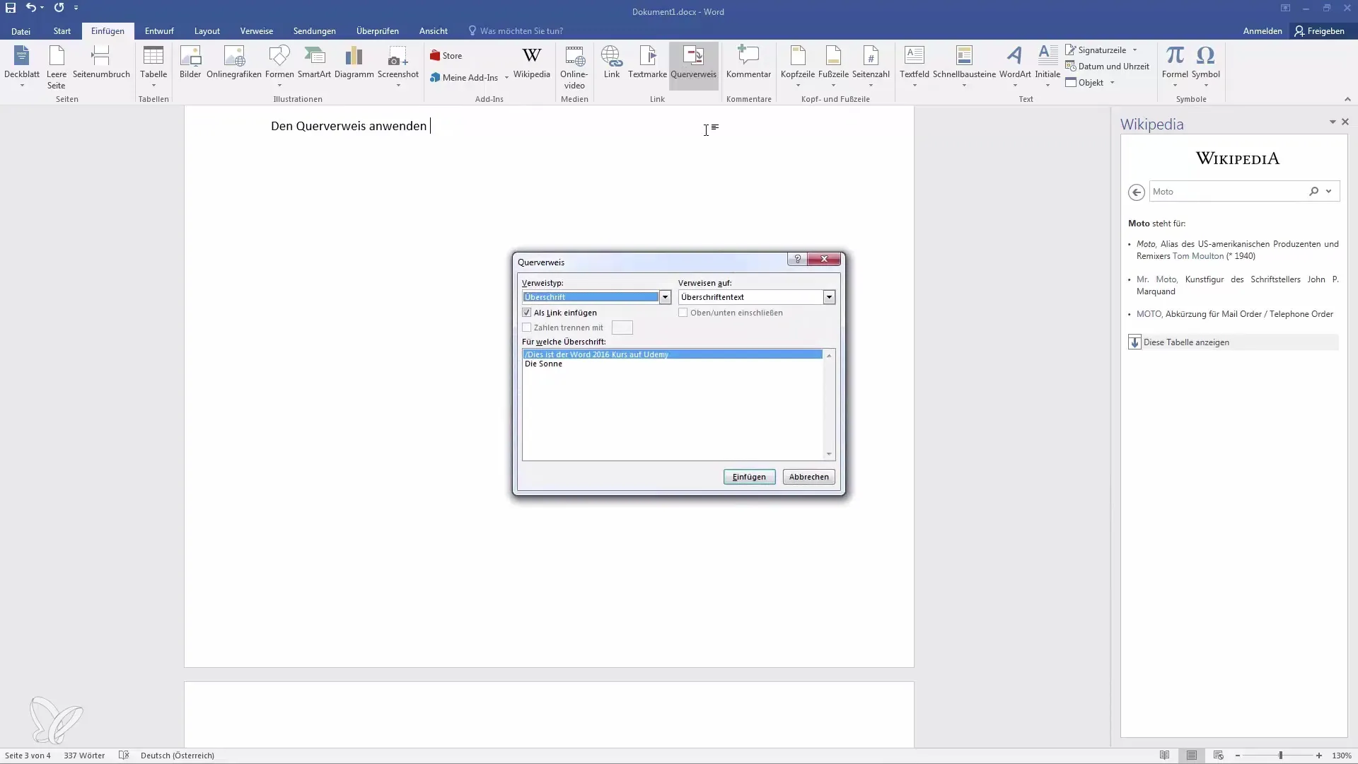 Nachdem du die Grundlagen von Links und Textmarken kennengelernt hast, ist der nächste Schritt, Querverweise zu erstellen. Querverweise erlauben es dir, auf Textmarken oder Absätze innerhalb des Dokuments zu verweisen. Klicke dazu in deinem Dokument auf „Einfügen“, und wähle anschließend „Querverweis“.