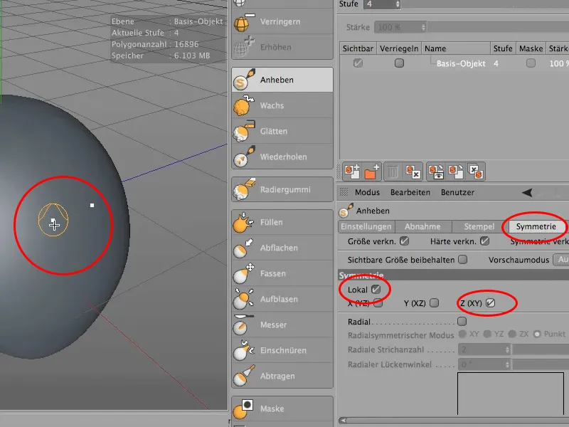 Dann wechseln wir auf den Reiter Symmetrie und kontrollieren, ob "lokal" ausgewählt ist. Dies bewirkt, dass sich alle Veränderungen auf das Objekt beziehen und nicht auf das Weltraster. Damit sich die Änderungen auf beiden Seiten des Objektes auswirken, wählen wir noch die Z-Achse aus. Wenn ihr jetzt testet, sollte es sich auf beide Seiten des Schädels ändern..webp?tutkfid=74477)
