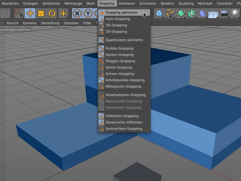 Weil wir es bei der Arbeit im Raum grundsätzlich mit einer Achse mehr als bei einem 2D-Bildbearbeitungsprogramm zu tun haben, kommt dem Snapping, dem Einrasten von Elementen, eine besondere Bedeutung zu.