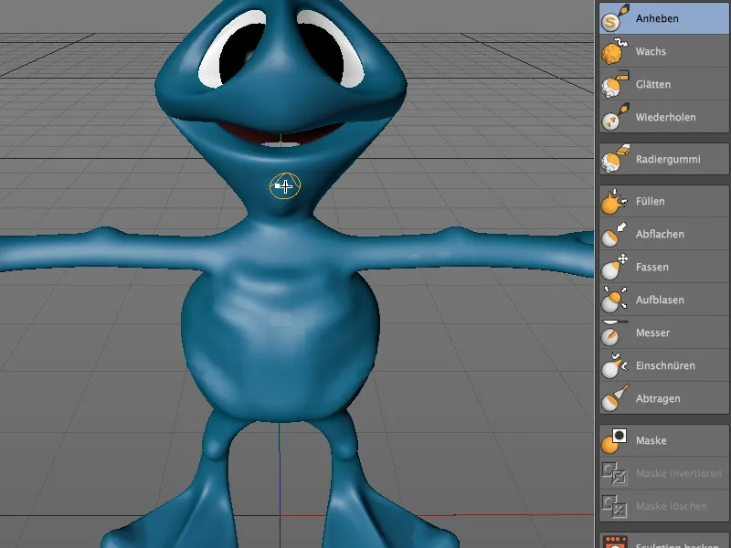 Wir bleiben beim Anheben-Pinsel, wenden uns dem Hals des Aliens zu und deuten einen Adamsapfel vom unteren Halsansatz bis zur Halsmitte an.