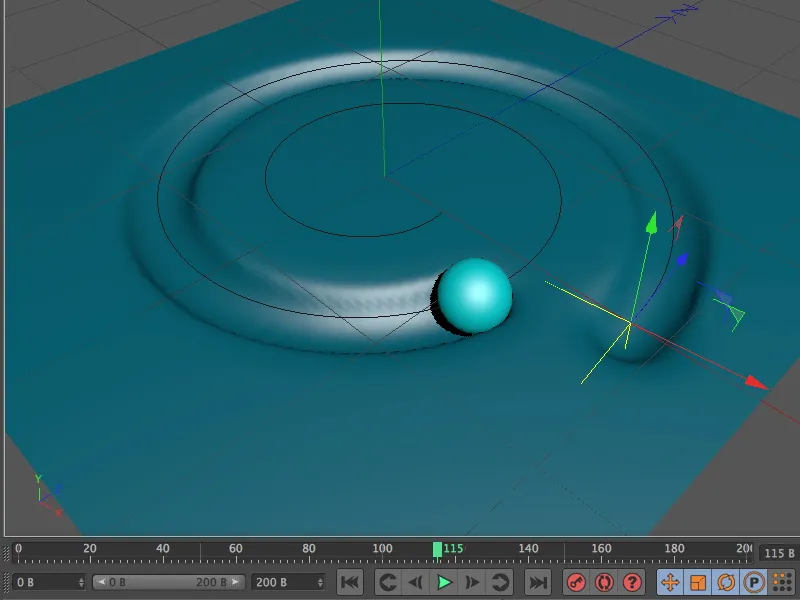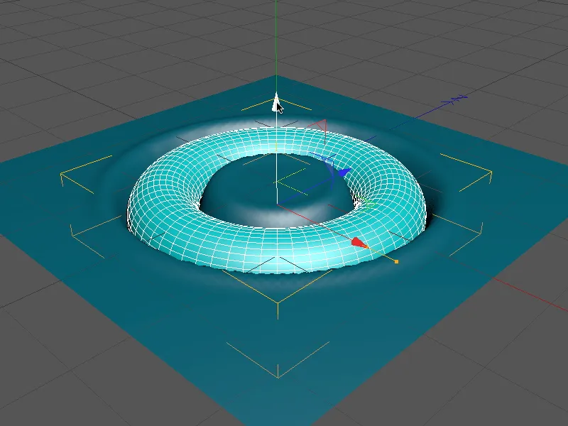 … bis die Lage des Ring-Objekts dem Kollisions-Deformer mitteilt, dass es sich innerhalb der Ebene befindet und eine Ausformung ausbildet.