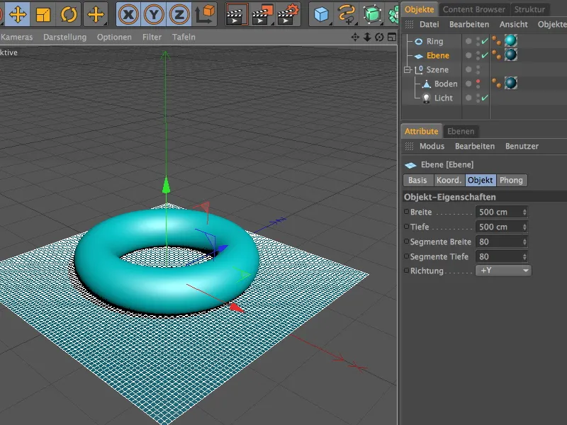 Sehen wir uns kurz die Elemente der Szene an. Das Ebene-Objekt ist ausreichend groß, um alle Deformationen des Ring-Objekts aufzunehmen. Genauso wichtig ist die relativ hohe Unterteilung (Segmentierung) in Breite und Tiefe. Bei ungenügender Unterteilung kann keine weiche Deformation bei der Kollision mit einem anderen Objekt stattfinden; die Oberflächen sehen dann entsprechend gezackt und treppenförmig aus.