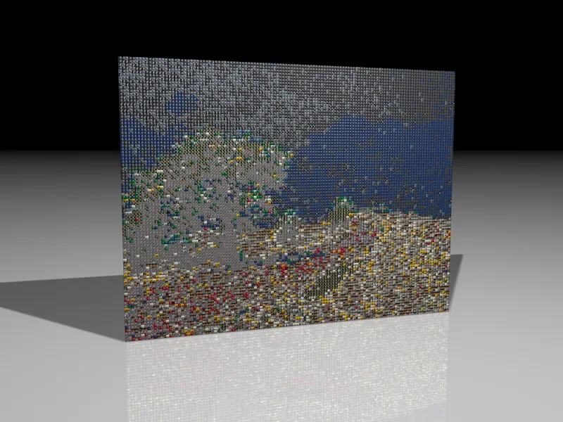 Nun können wir über die Taste F1 wieder in die Zentralperspektive wechseln und das Mosaik der nun fertig texturierten Klon-Wand rendern. Je mehr Farbtöne ihr dem Mosaik über die Texturen der Mosaiksteine zur Verfügung stellt, desto besser kann der Shader-Effektor das Mosaik umsetzen.