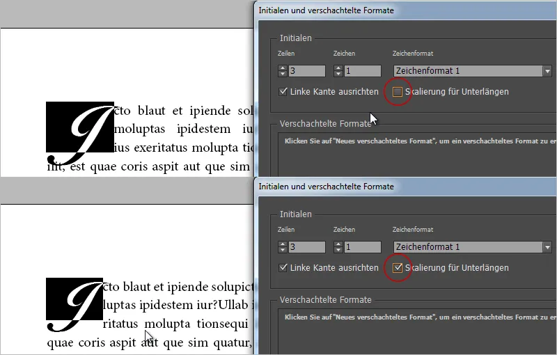 Falls der Weißraum durch die Ausrichtung auf linke Kante nicht ausreicht, kannst du vor dem Initial einen Leerraum (z. B. Achtelgeviert mit Strg+Alt+Shift+M) einfügen. Nun definierst du für dein Initial zwei Zeichen, wobei eines dein Leerraum ist. Es kommt zu einer Unterschneidung und mit den Kerning-Einstellungen kannst du die linke Ausrichtung auf Kante genau feinjustieren.