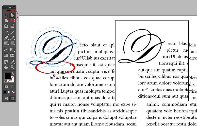 Ein Tipp: Du kannst den Textumfluss auch noch im Detail steuern, indem du das "D"-Objekt mit dem Direktauswahl-Werkzeug anklickst. Es erscheinen die Textumflusspunkte. Jetzt kannst du einzelne Textumflusspunkte verschieben und so beispielsweise den unteren Textumfluss verjüngen, damit die untere Zeile noch nach oben rutscht.