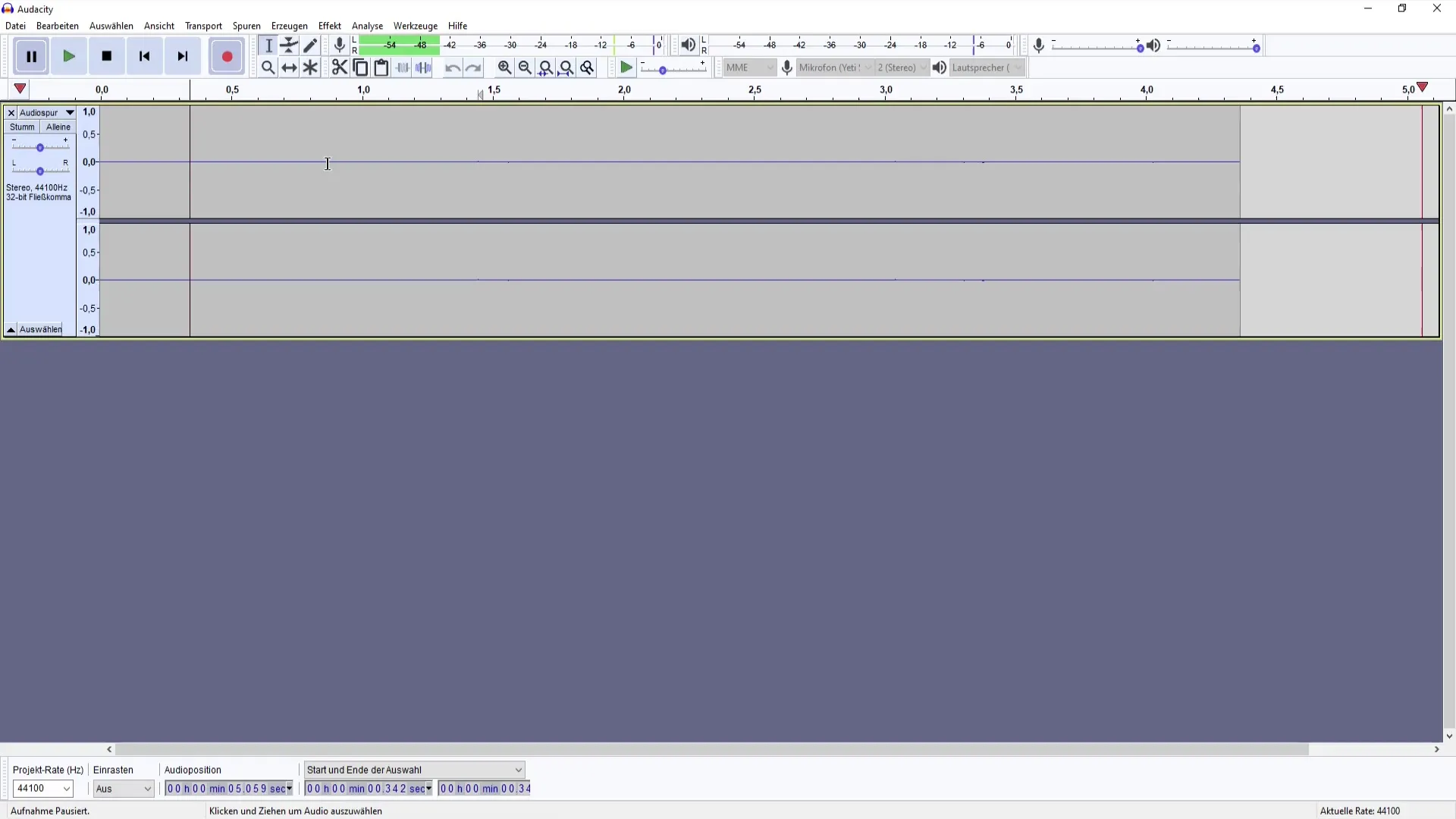 Zunächst musst du Audacity laden und ein neues Projekt erstellen. Du solltest deinen Audio-Input entsprechend einstellen, sodass du mit der Aufnahme beginnen kannst. In der Regel wird empfohlen, mindestens vier Sekunden Stille aufzunehmen, um ein genaues Rauschprofil zu erstellen. Damit hast du einen guten Ausgangspunkt, um das Rauschen zu identifizieren.