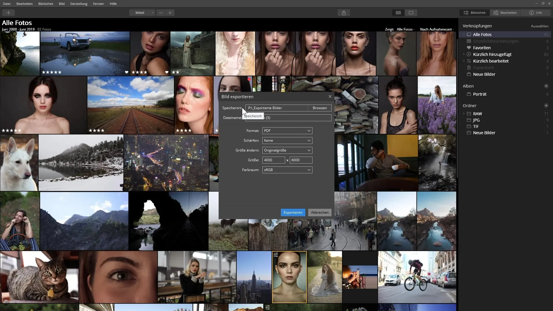 Wie passe ich die Qualität beim Export an?Im Exportdialog kannst du die JPEG-Qualität auf 80 bis 100 % nach Bedarf einstellen.