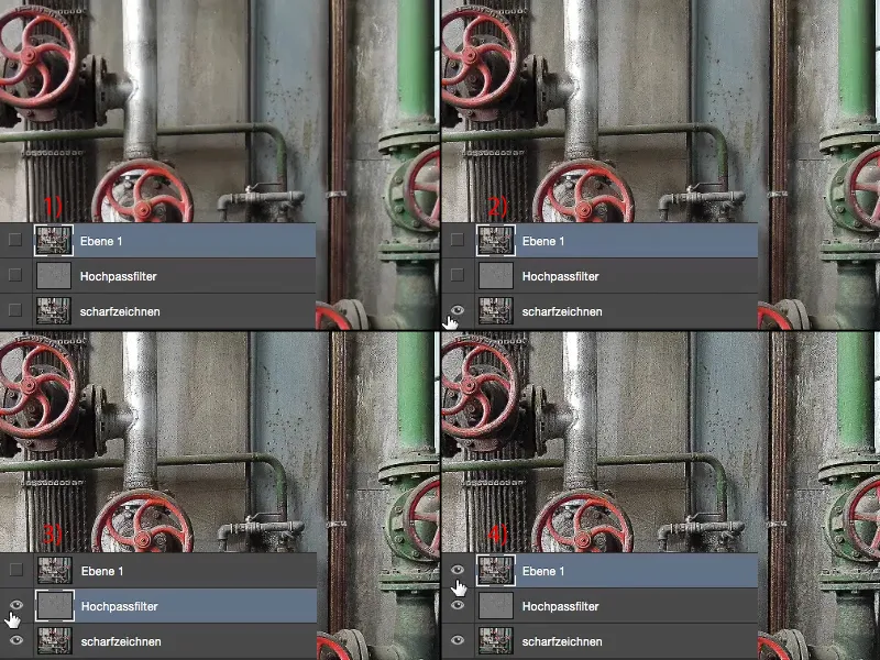 Jetzt können wir uns hier die Steigerung anschauen. Das ist das fade Originalbild (1). Mit dem Scharfzeichnen-Filter eigentlich perfekt nachgeschärft (2), aber diese Schärfe macht noch den Bildlook nicht aus beim Scharfzeichnen. Der Hochpass-Filter (3) holt jetzt wirklich so das Letzte raus. Und der Unscharf maskieren-Filter (4) überzeichnet mir das Ganze. Das führt aber auch dazu, dass selbst die Wände, die im Original sehr glatt waren, plötzlich Strukturen bekommen. Das will ich hier bei diesem Bild. Für mich ist das Bild nicht kaputt. Für mich ist das Bild jetzt so richtig griffig texturiert.