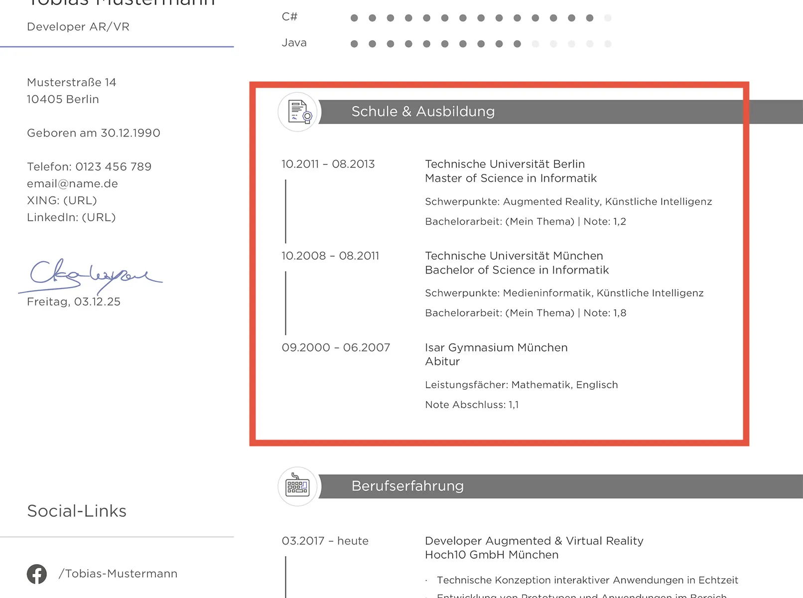 - Επαγγελματική εμπειρία και Εκπαίδευση: Αυτό το τμήμα περιλαμβάνει την εργασιακή πορεία και την εκπαιδευτική διαδρομή. Στην επαγγελματική εμπειρία αναφέρονται οι θέσεις, τα ονόματα των εταιρειών, η διάρκεια των απασχολήσεων και οι σημαντικές ευθύνες ή επιτεύγματα. Στην εκπαιδευτική περιοχή αναφέρονται τα εκπαιδευτικά ιδρύματα που επισκέφθηκε, τα πτυχία που απέκτησε και οι περίοδοι σπουδών.