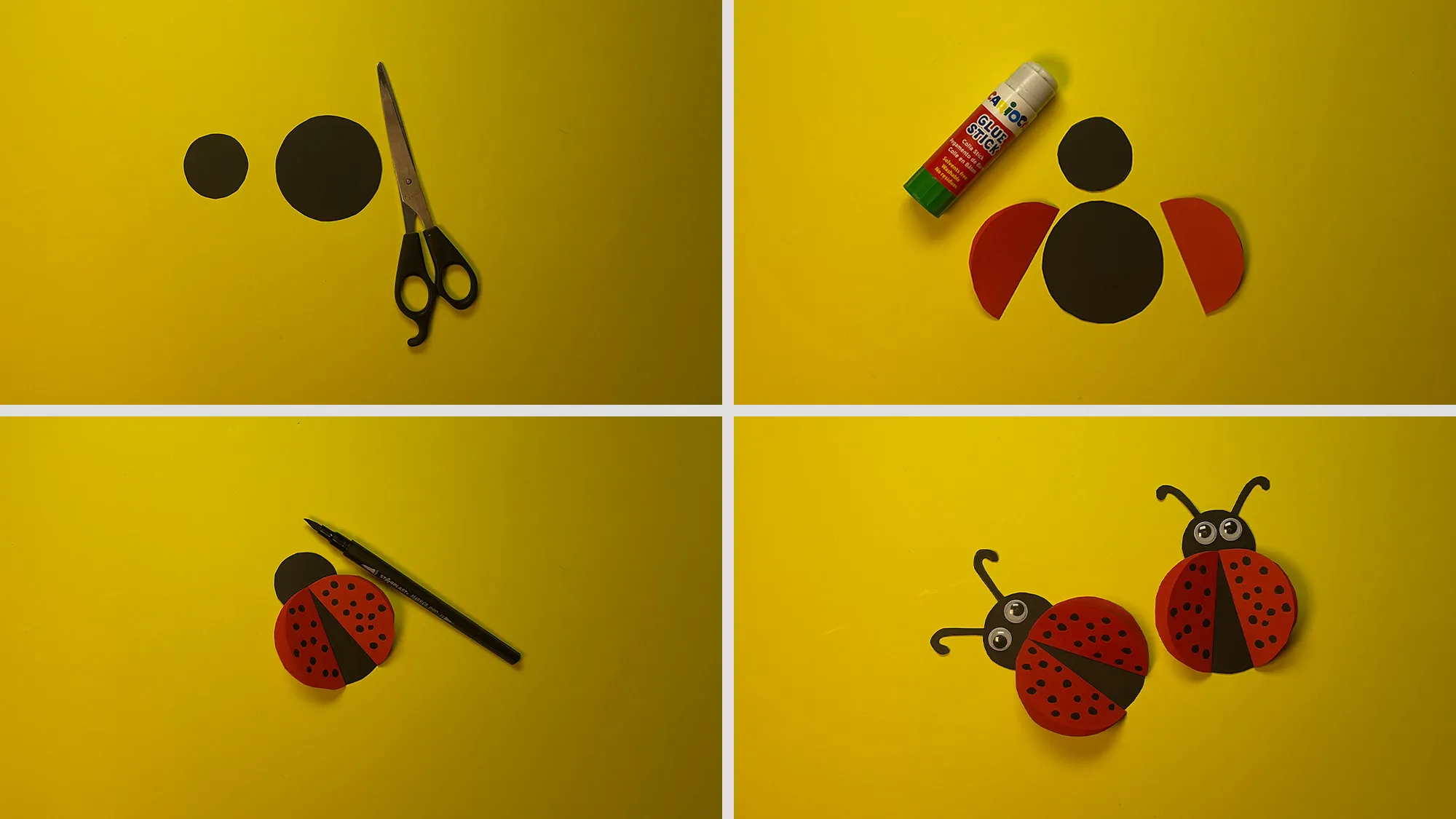 Arrange the cut-out parts and glue them together: place the black circle as the body in the center and the red semicircles as wings on either side. Use a black pen to draw dots on the red wings. Attach the small black circle as the head to the top of the body. Finally, glue the googly eyes onto the head and draw the antennae with the black pen. Your cute ladybugs are ready!