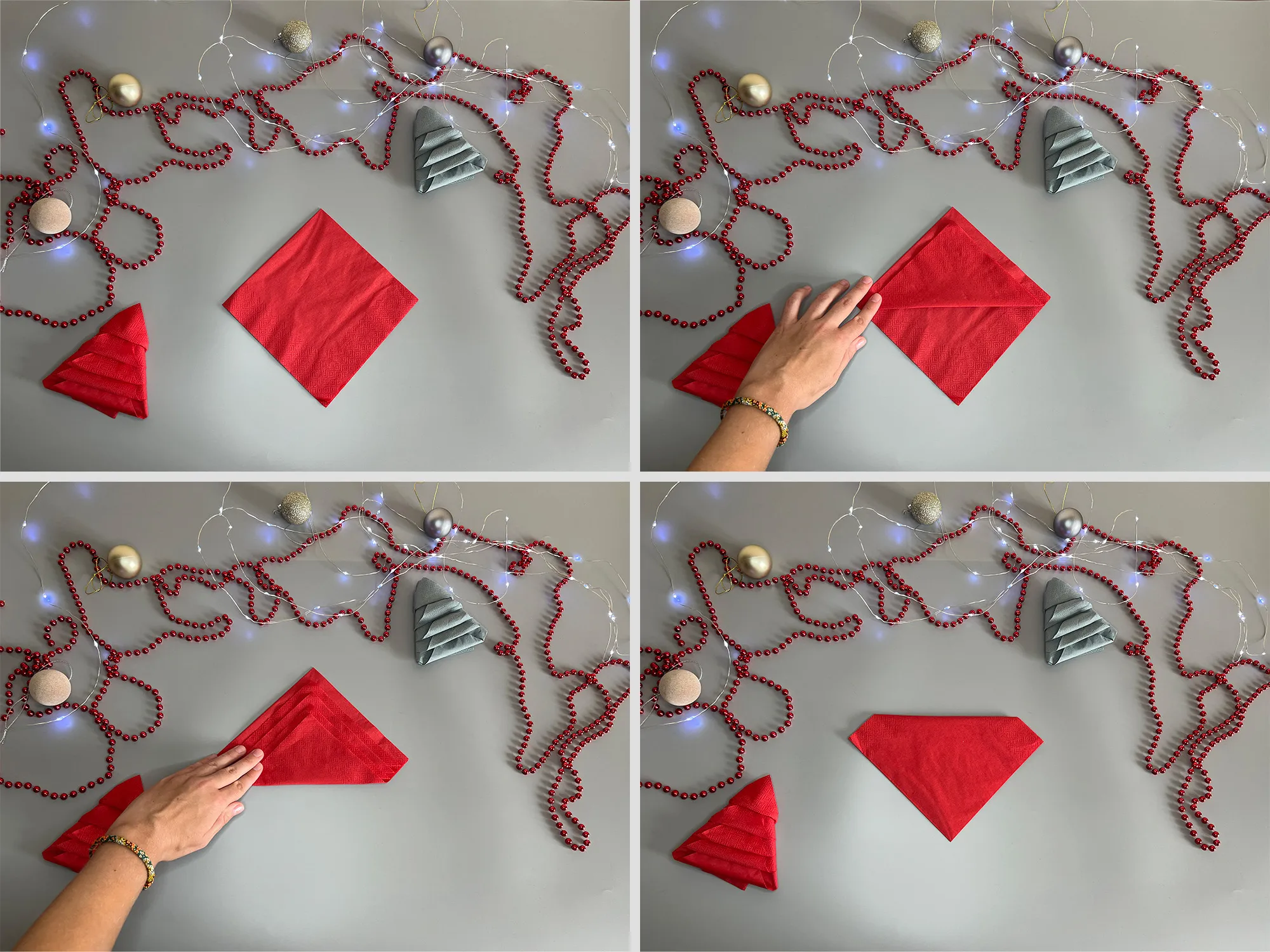 On our portal, you will find many instructions with photos and videos on napkin folding for Christmas. Before you start folding the napkin into a Christmas tree, we recommend watching the video. Then, you can follow the step-by-step guide. We have provided a photo for each step to make it easy for you to follow the instructions.