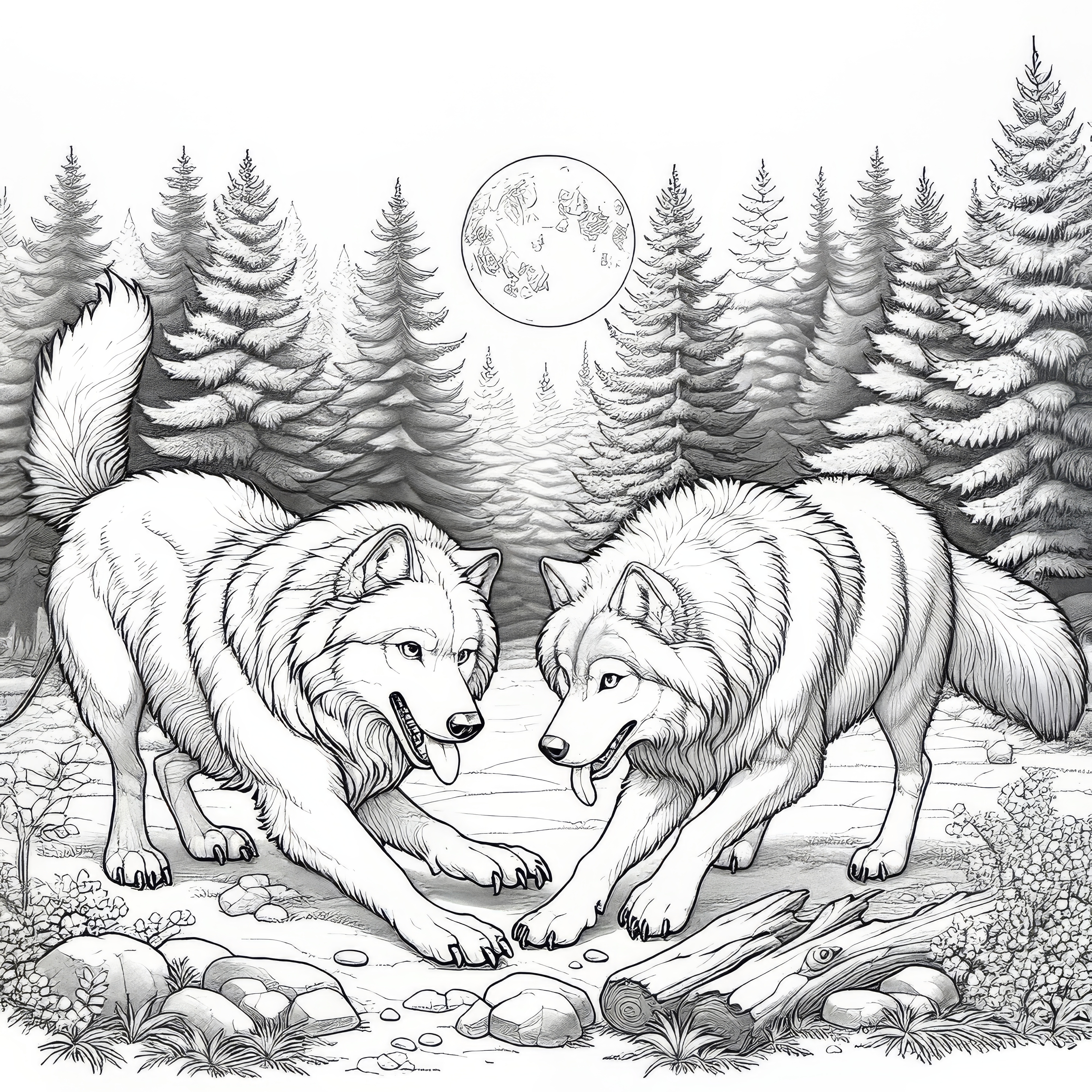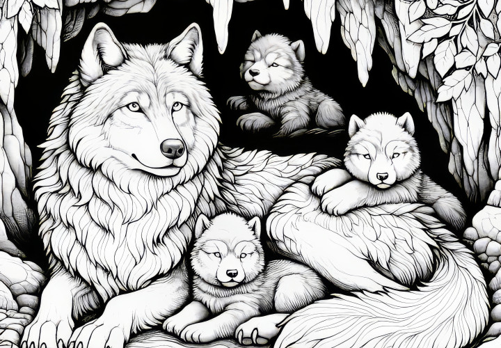 Wolfess with her puppies rests in a cave: Coloring template to download (Free)