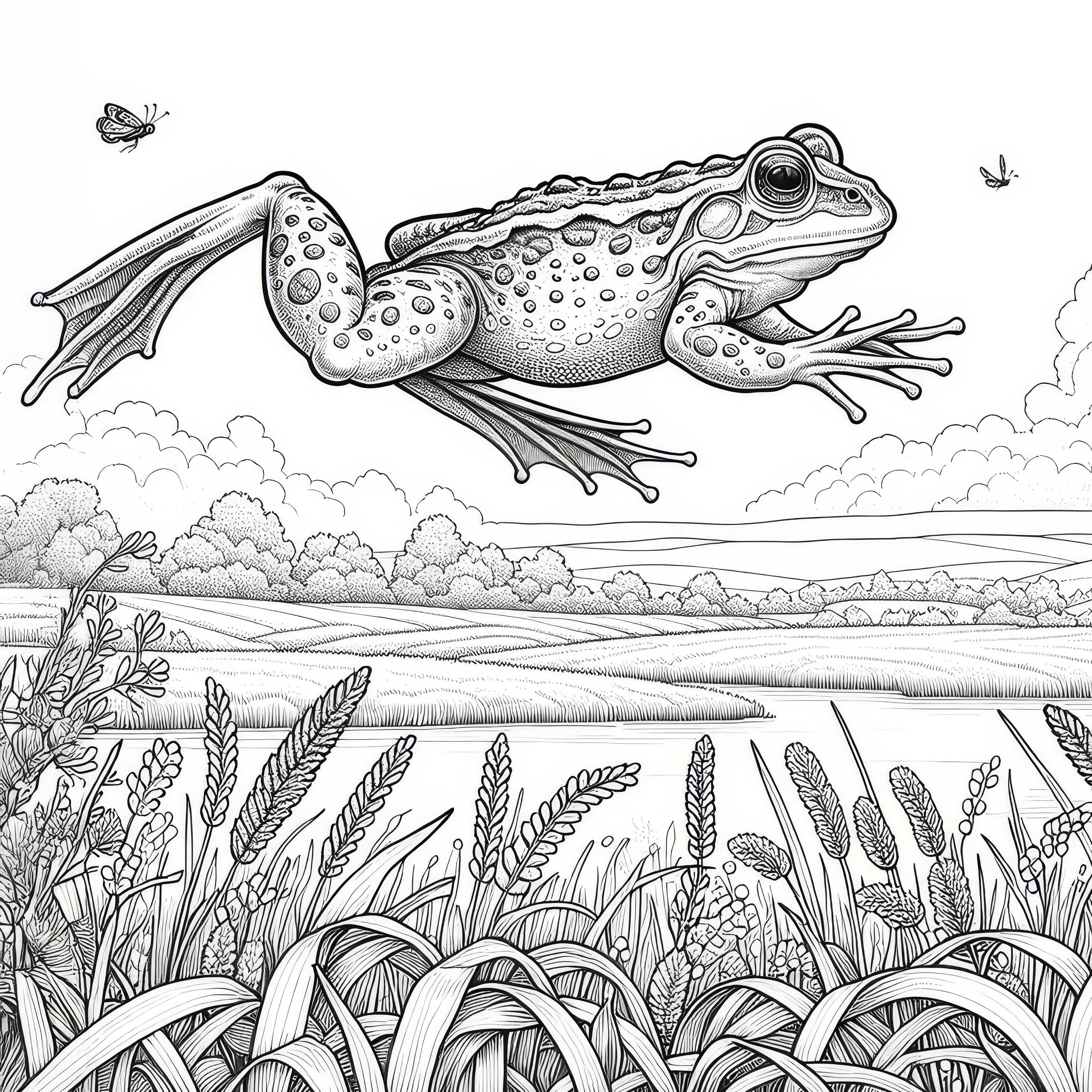 Frogs jump happily around in the pond: Coloring page for download (Free)