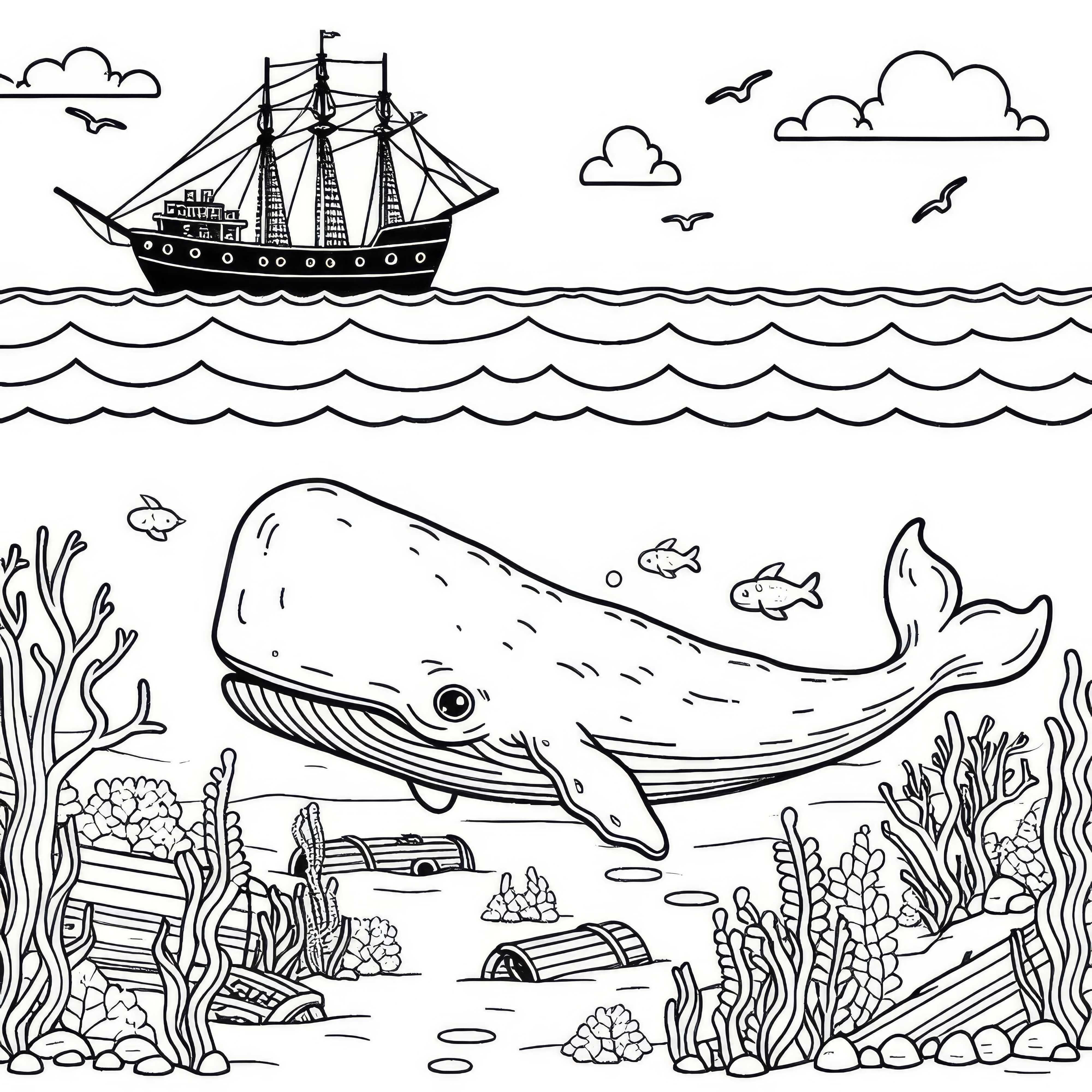 Sperm whale swims over shipwreck: Coloring page for download (Free)