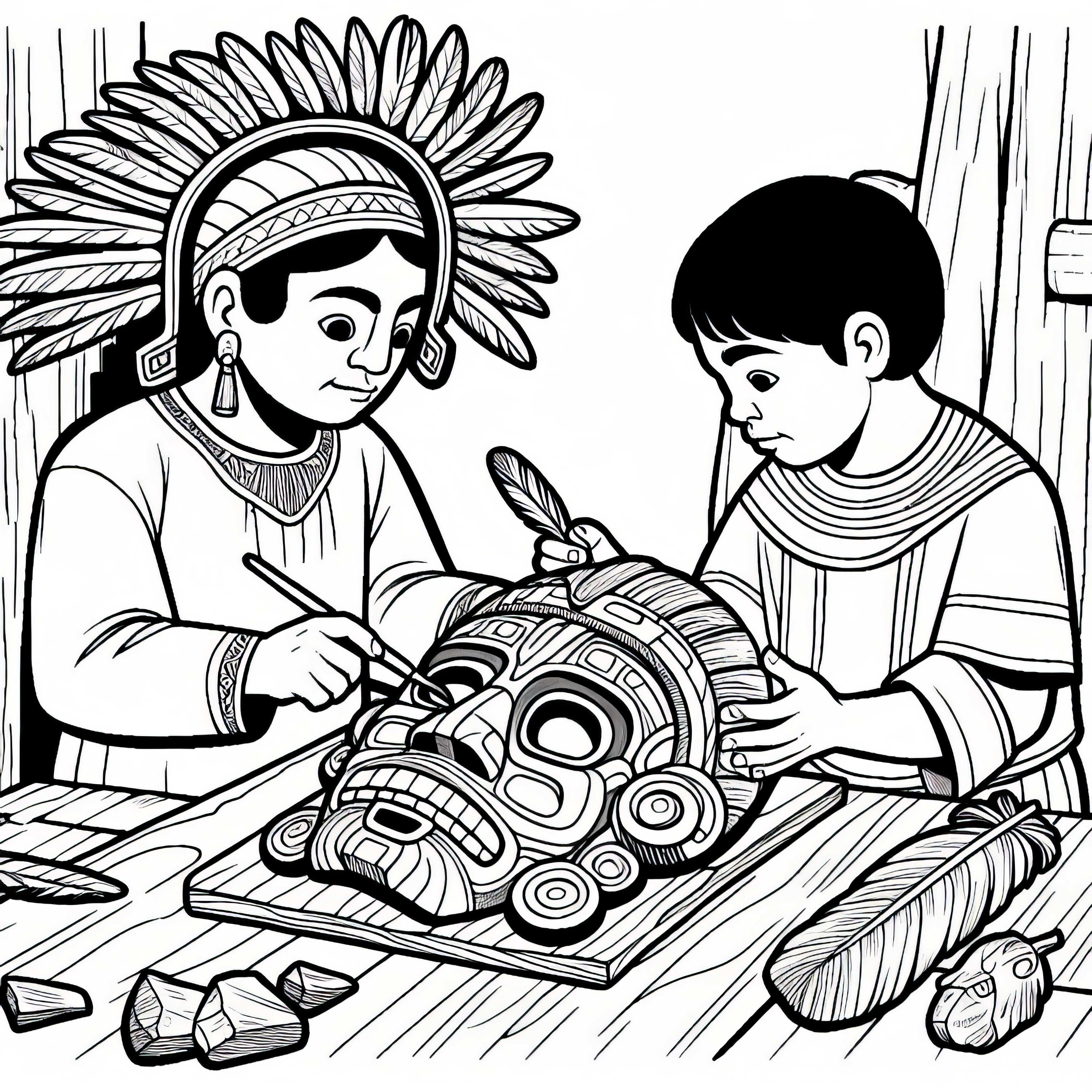 Coloring template: Children practice writing pictures on bark - Aztecs
