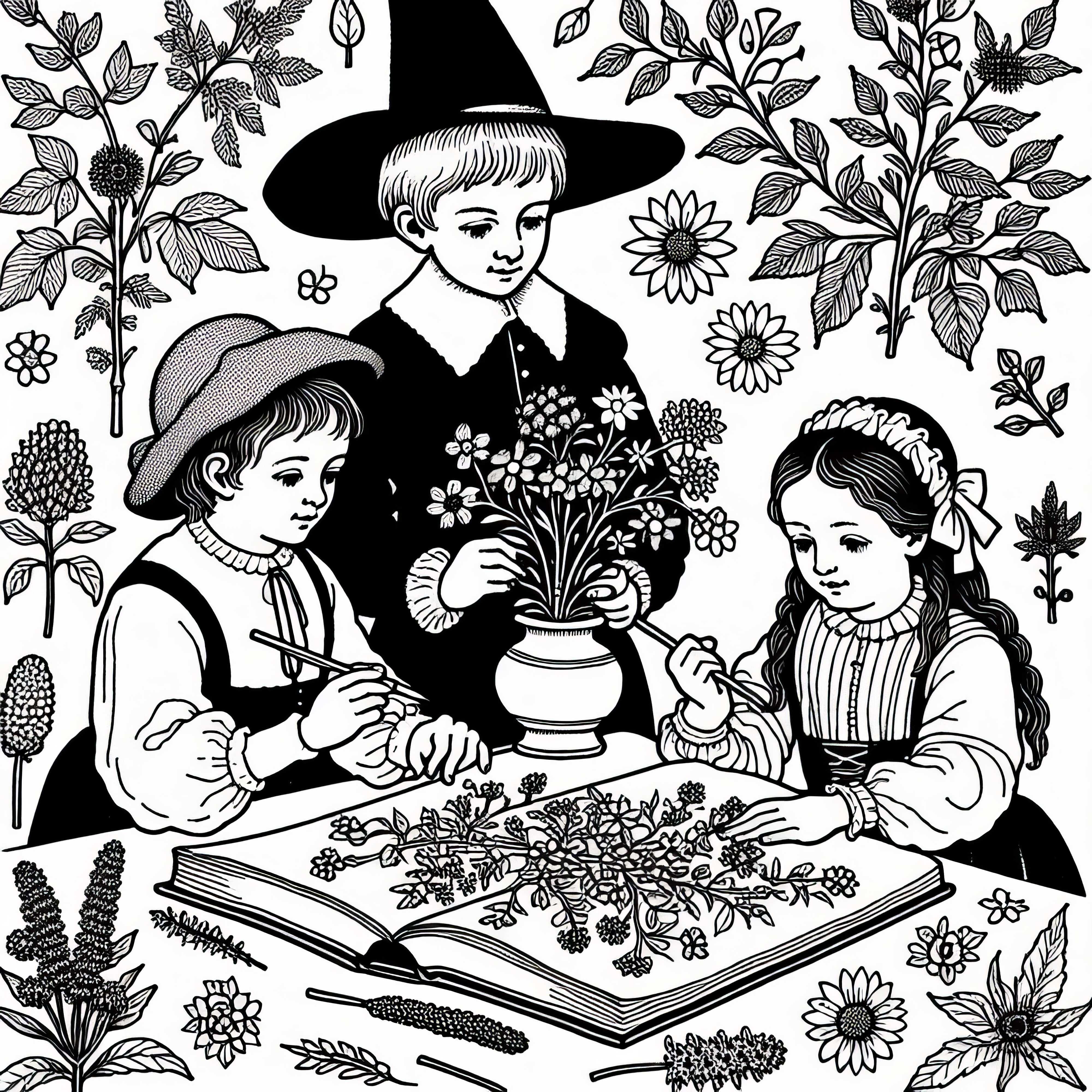 Sort herbs on the table: Download the coloring template for witch hunts for free