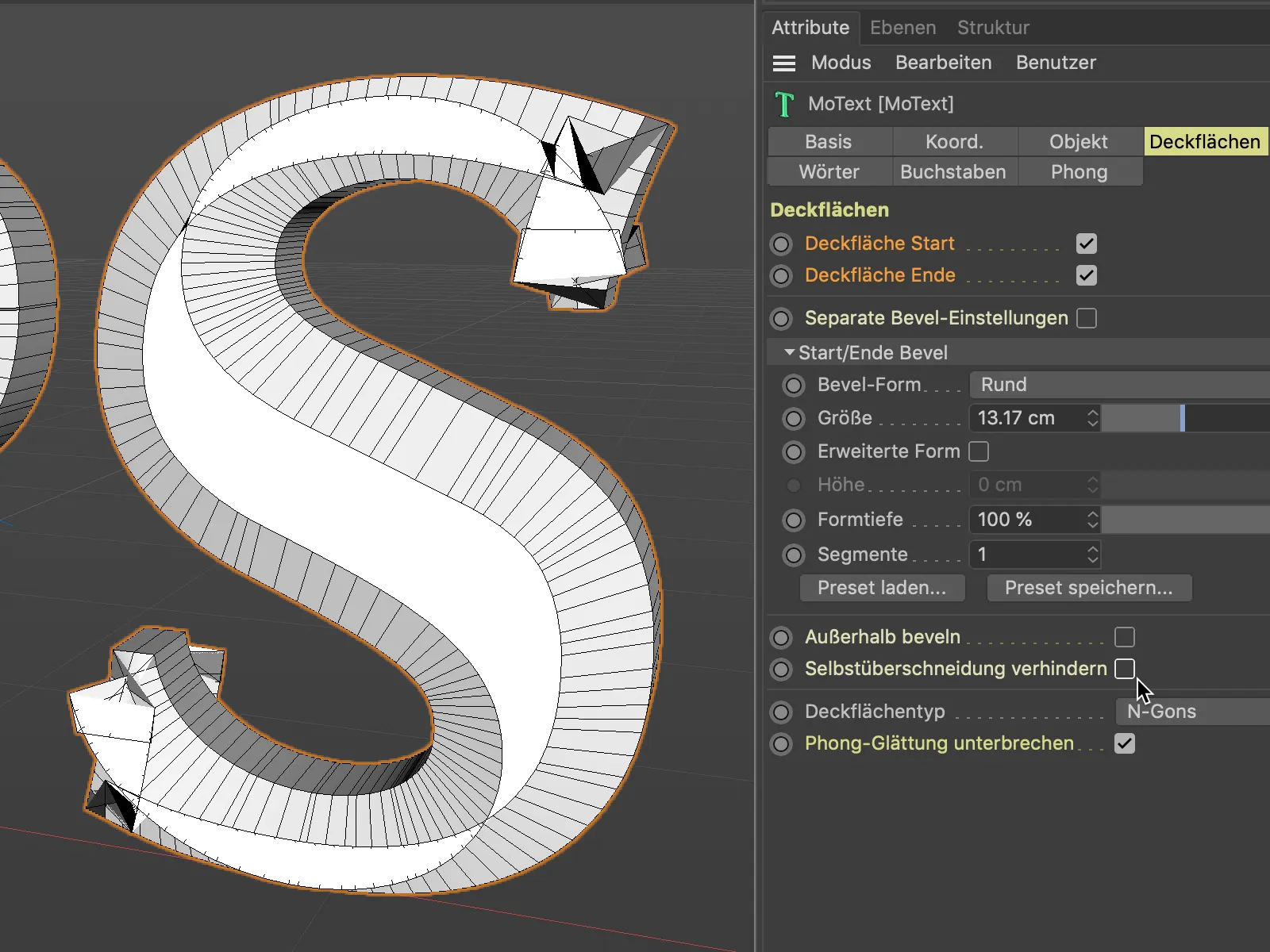 The bevels created so far have always been generated in the existing geometry. The depth of the text has therefore not changed as a result of the beveling. However, we can also generate the bevel as an extension of the existing geometry. For this comparison, I am using the bevel shape step with two segments.