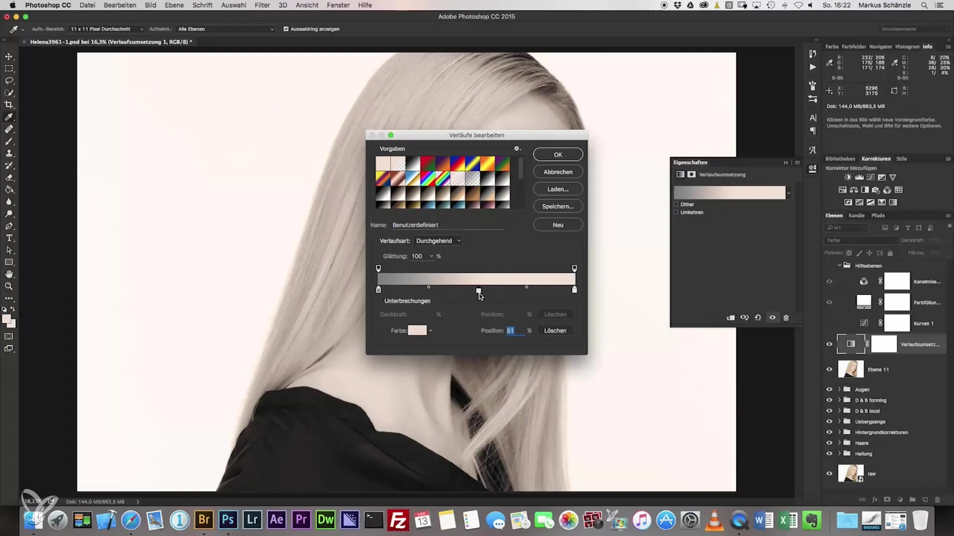 Make sure the mask looks good. With various tools and the Alt key, you can make adjustments to the mask. Create a soft edge around the facial features to achieve a natural blend.