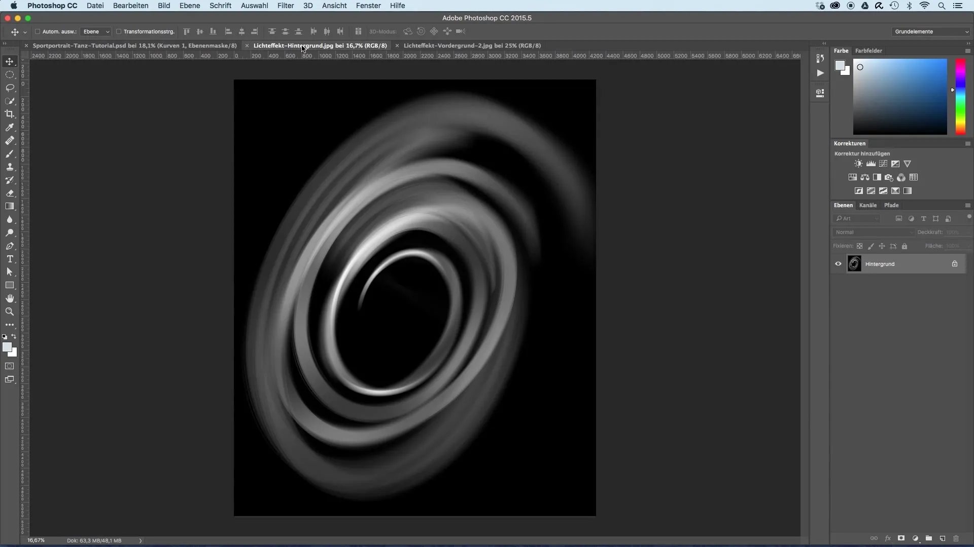 First, you need the light effects you want to use. In my example, I created a spiral that I will use for the image design. You will drag these light effects into your opened image using the move tool. Initially, position the effect in the center of the image.