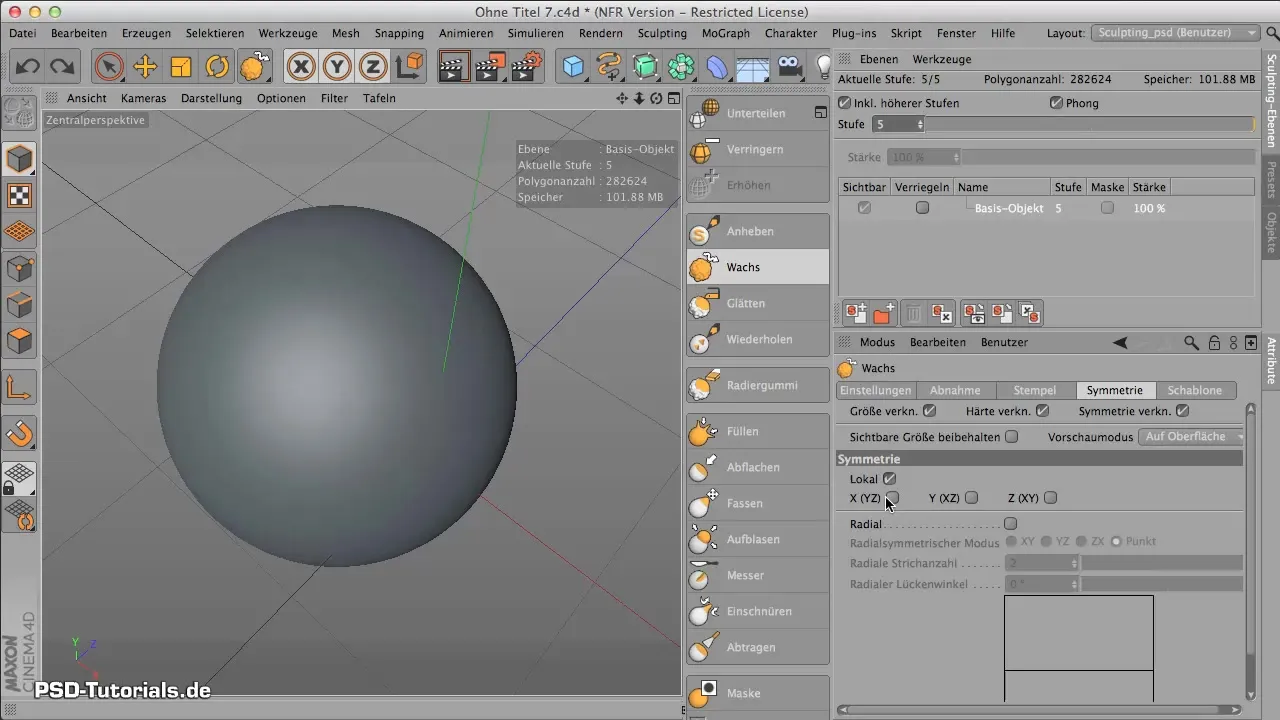 The ability for symmetry is particularly important for modeling characters. You do not want to create the same shapes twice for the left and right sides of a face or body. Once you activate symmetry and link the tools, changes on the left side will automatically affect the right side.
