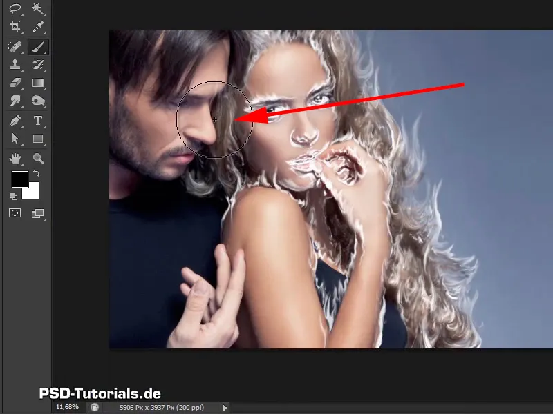 With full opacity, simply paint over the areas that don't affect the woman's hair and remove the soft focus. This doesn't have to be too precise, but of course the man should be in focus. But in the transition areas, it is not 100% important how you draw along the contours.