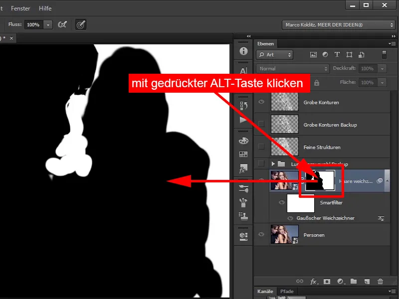 Now you only have the hair, which is blurred. By the way, if you now click on the mask with the Alt key, you can also see what you have now masked.