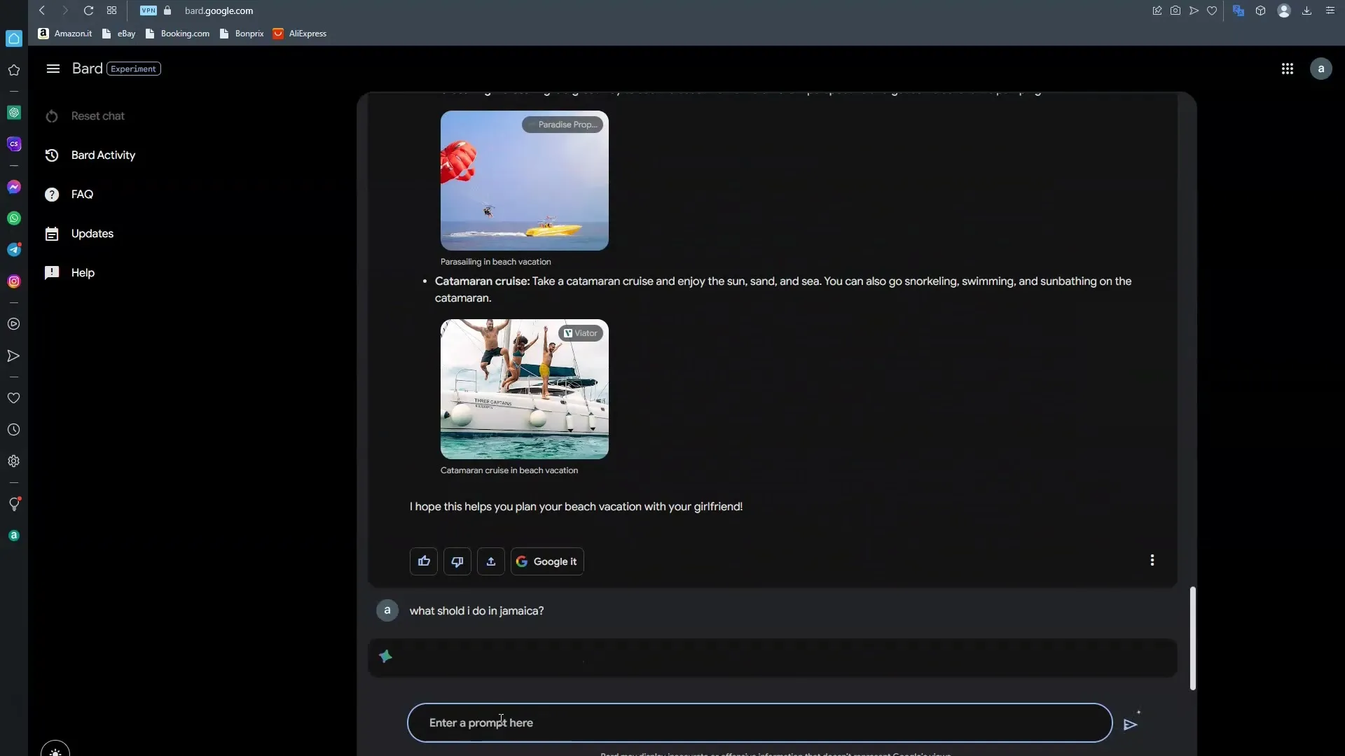Once you have selected your destination, the next step is to search for activities you can undertake there. Simply enter a command like: "What can I do in Jamaica?" and Google Bard will immediately show you a list of the best activities.