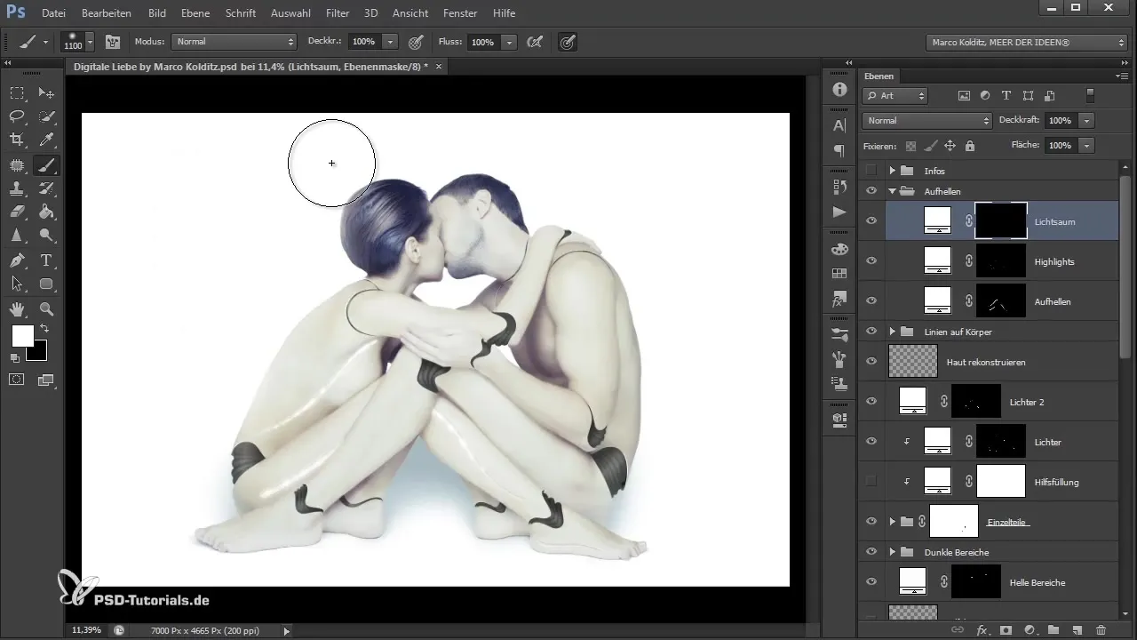 First, create a new group above the lines on the body group and name it "Brighten". Choose a soft brush with full opacity to make the curved lines of the woman glow. Set the layer to "Soft Light" mode and begin painting in the desired area. Make sure that the opacity can vary depending on the area to create a natural glow.