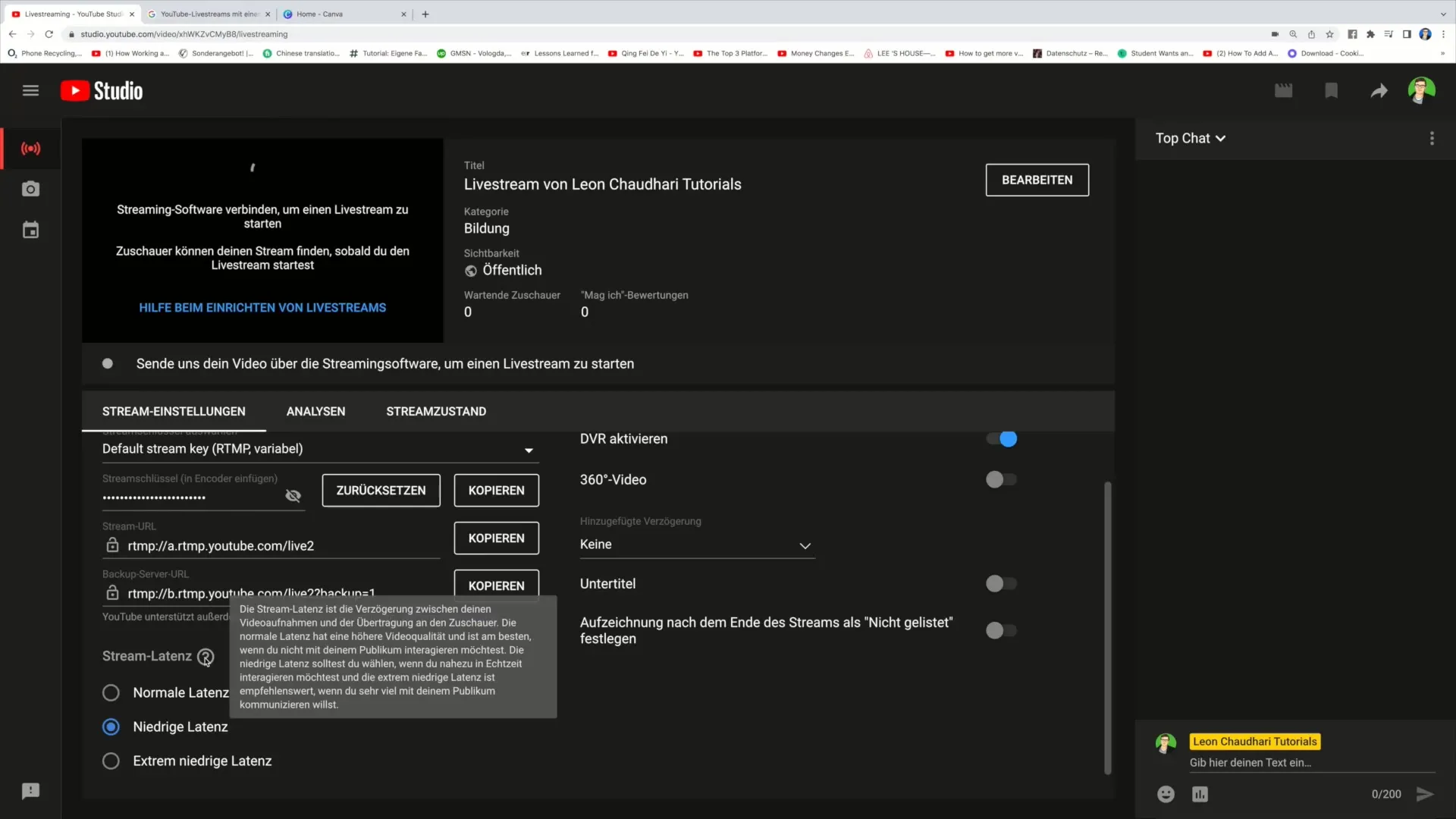 In the Livestream Control Room, you can make various settings such as choosing the stream latency. You have the options of "Normal," "Low," and "Ultra-Low." The choice of latency affects how quickly your viewers can react to your actions. Additionally, you can set the visibility of your stream, for example, "Public" or "Unlisted."
