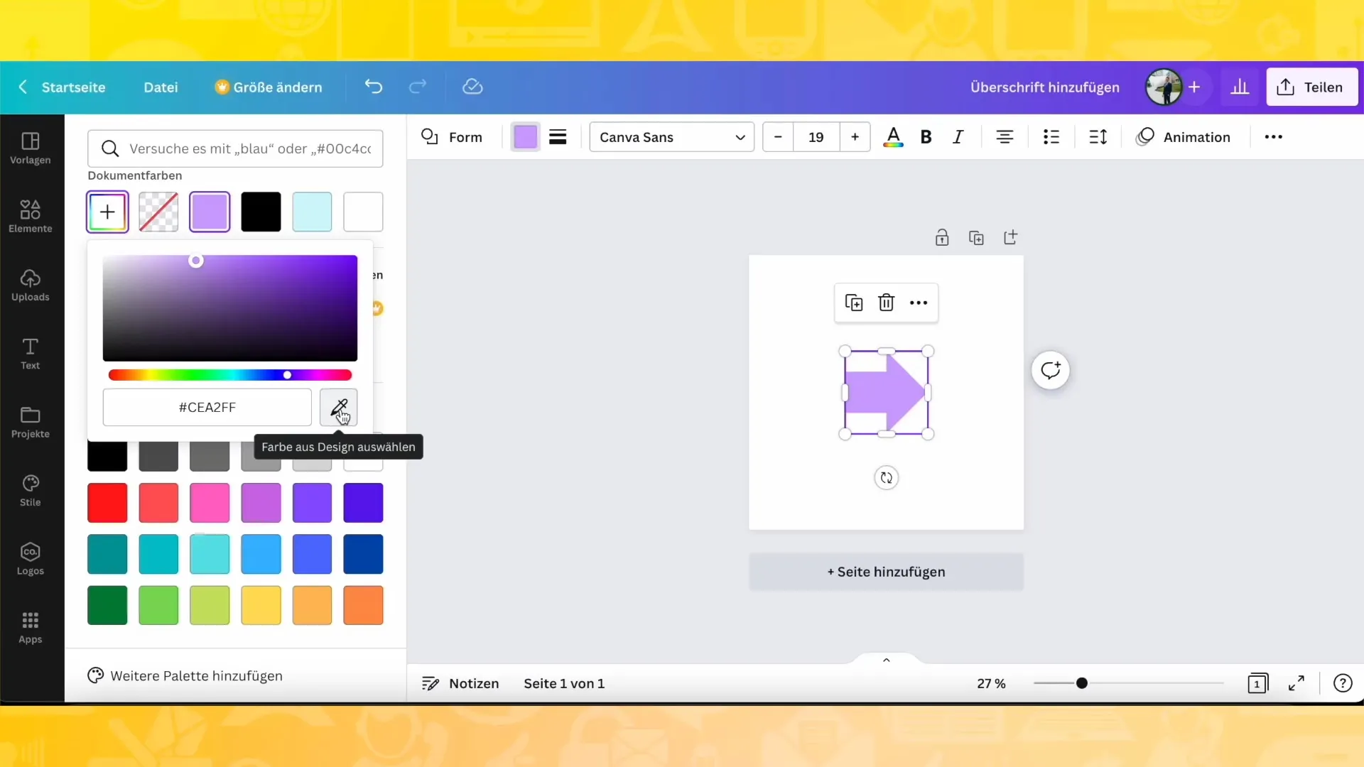 Once you have inserted an element, you can adjust its color. Select the element and click on the color symbol in the top bar. Here you have the option to choose between predefined colors or select a custom color. If you want to take a specific color from another part of your design, you can use the eyedropper tool to pick the desired color.