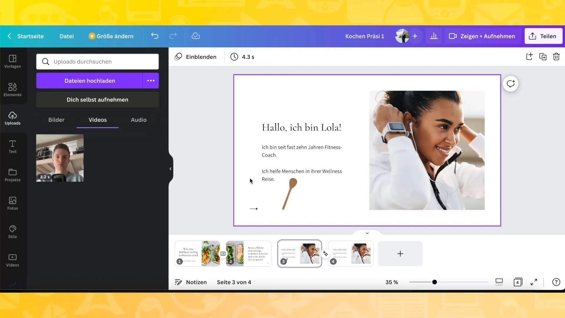 Go through the pages of your presentation. You can add or adjust texts, images, and other elements. Canva offers you a variety of animated texts and effects to make your presentation more dynamic. For example, you can animate the text or navigate through different transitions between slides.
