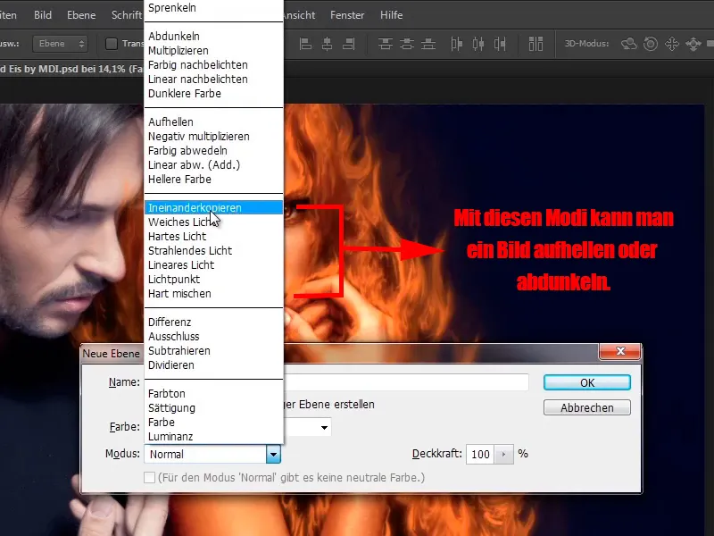 You can also select a blending mode directly, in this case you use the " Ineinanderkopieren" mode, because with this mode you can paint light and dark into the image and darken or lighten the image in this way.