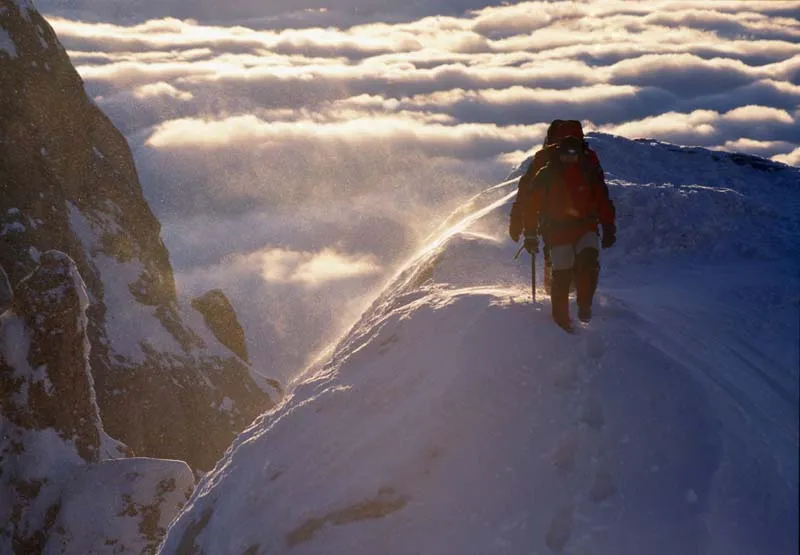 Minus 25 degrees and a high altitude storm on the summit ridge of the Marmolada. A perfect sea of fog above the valleys. The result was four exposed films and two frozen thumbs due to film and lens changes!!! Canon EOS 1V, EF 3.5-4.5 70-210 mm, Fuji Velvia. Marmolada, Dolomites, Italy.